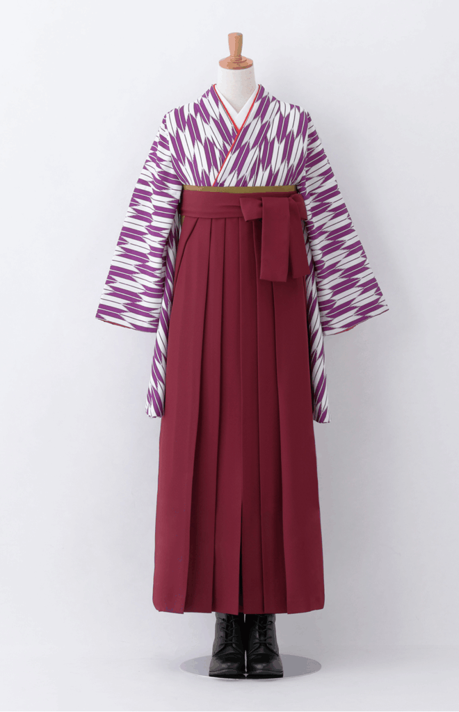エンジの袴を合わせることでパキッとした紫と白が引き立ち、全身のバランスが取れたコーデです。