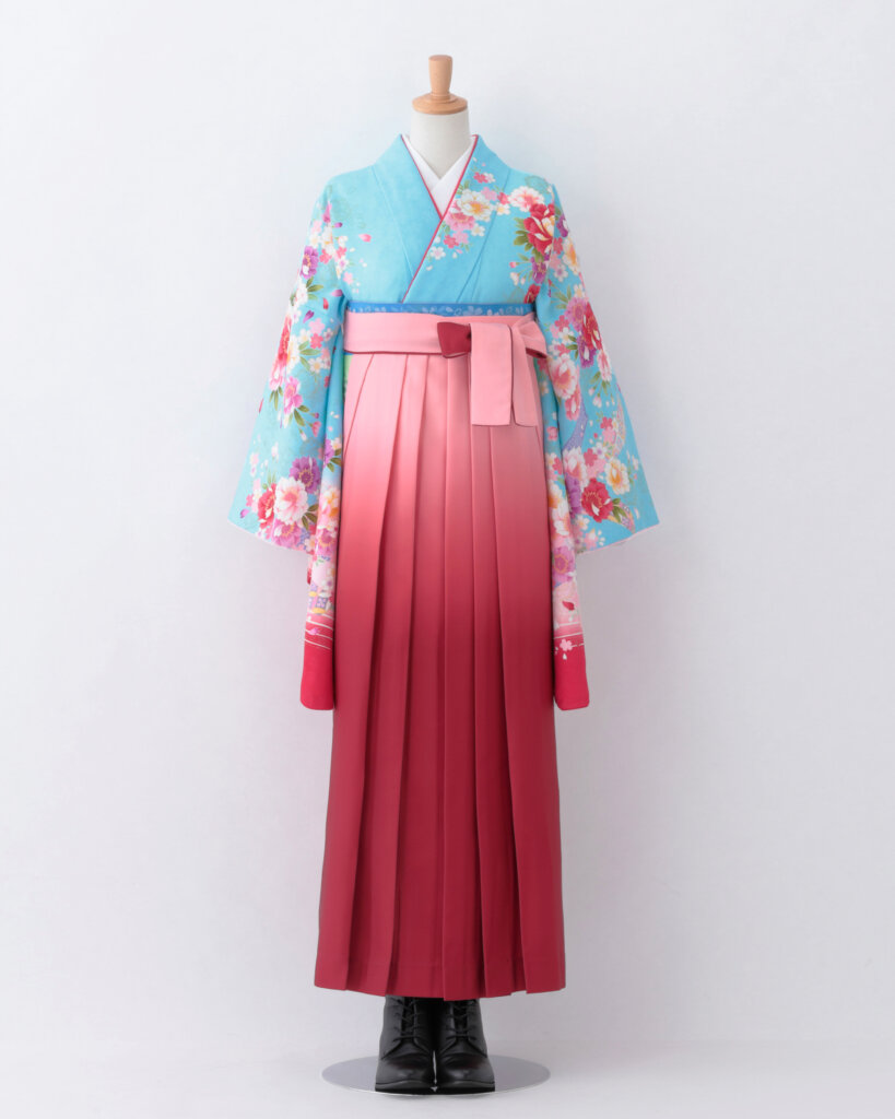 着物の袖が、袴と同じようにピンクから赤にかけてのグラデーションになっているため統一感ばっちり。