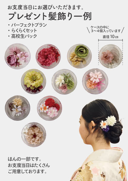 ※髪飾りはおひとつ、予約時またはお支度当日にお選びいただきます。