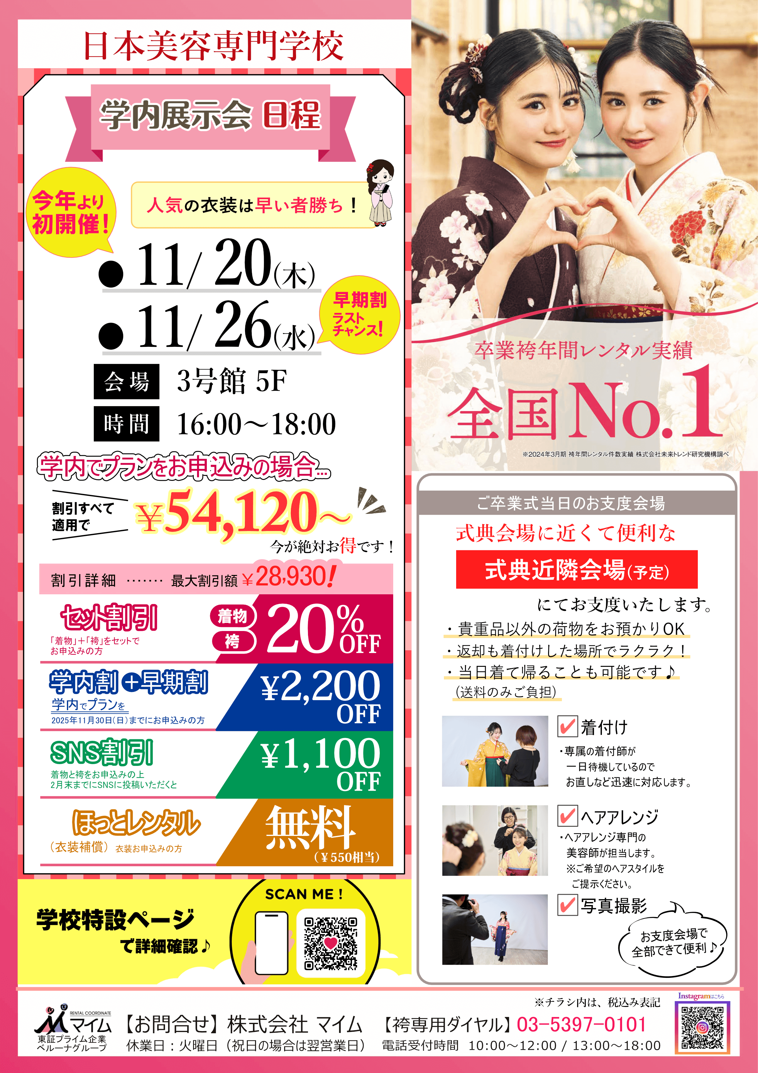 日本美容専門学校 ー 2026年卒業式レンタル袴情報 ー