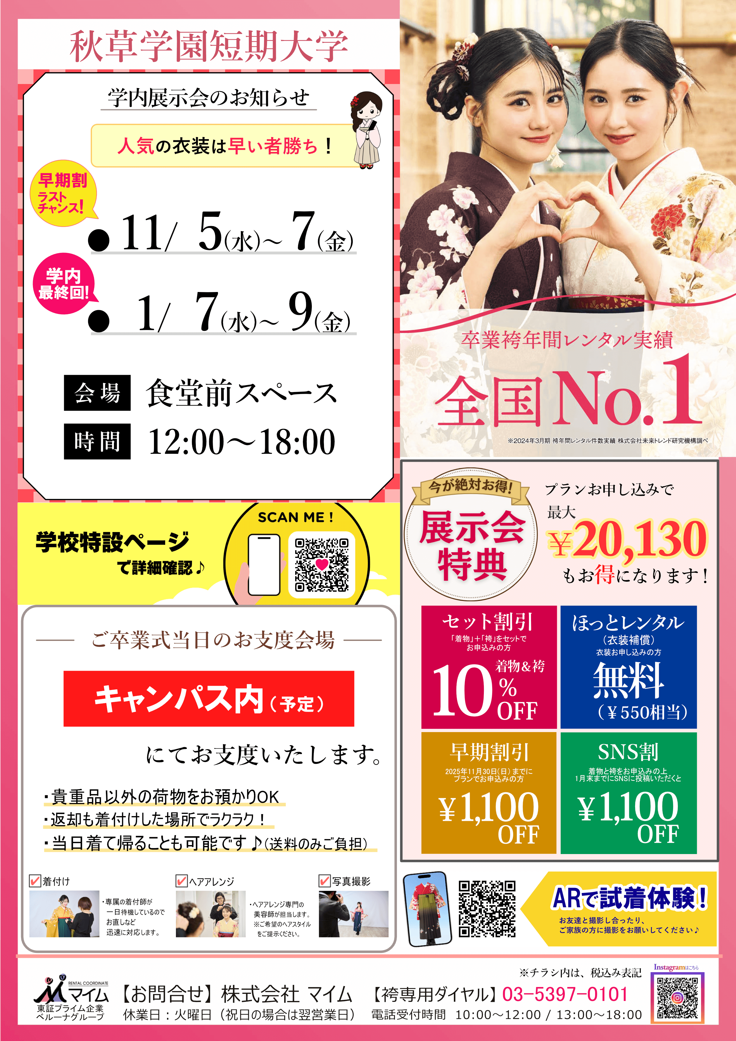 秋草学園短期大学 ー 2026年卒業式レンタル袴情報 ー