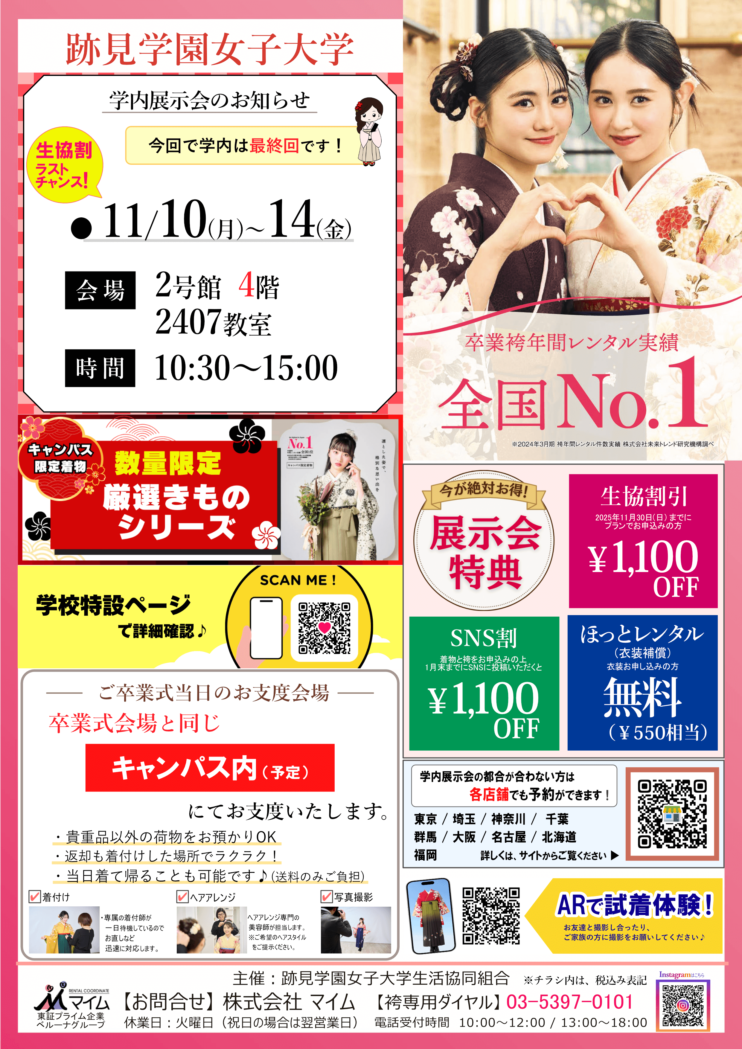 学内予約会は、マイムで人気の着物と袴をあなたの学校で試着したり、気に入ったらその場で予約できちゃう展示会です。※イベントは、急遽延期や中止になる場合もあります。あらかじめご了承ください。