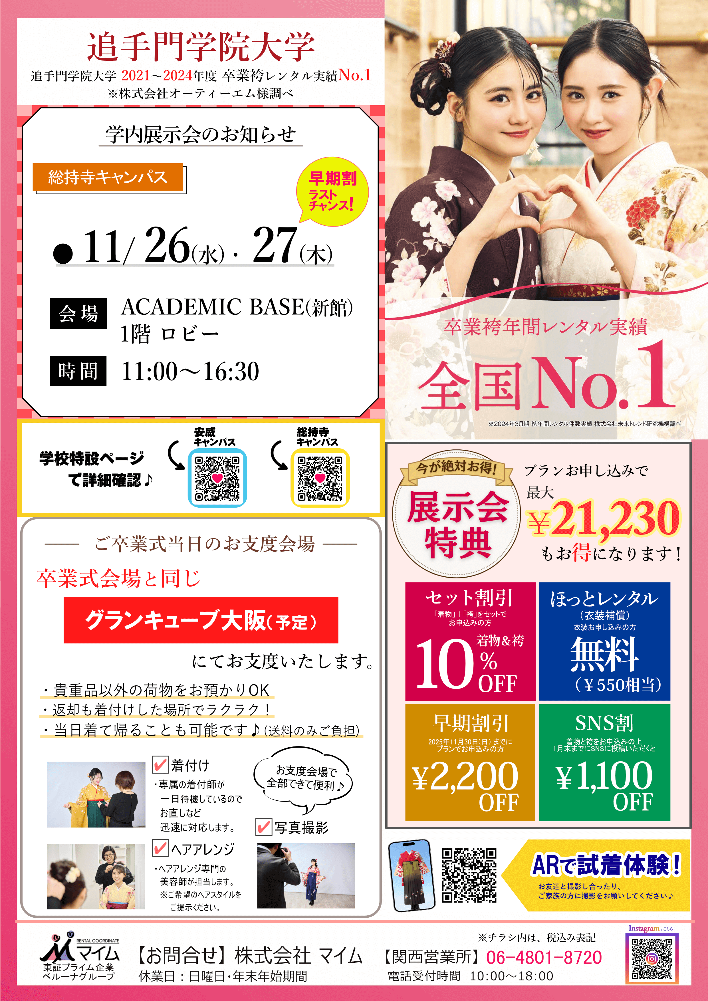 学内予約会は、マイムで人気の着物と袴をあなたの学校で試着したり、気に入ったらその場で予約できちゃう展示会です。※イベントは、急遽延期や中止になる場合もあります。あらかじめご了承ください。