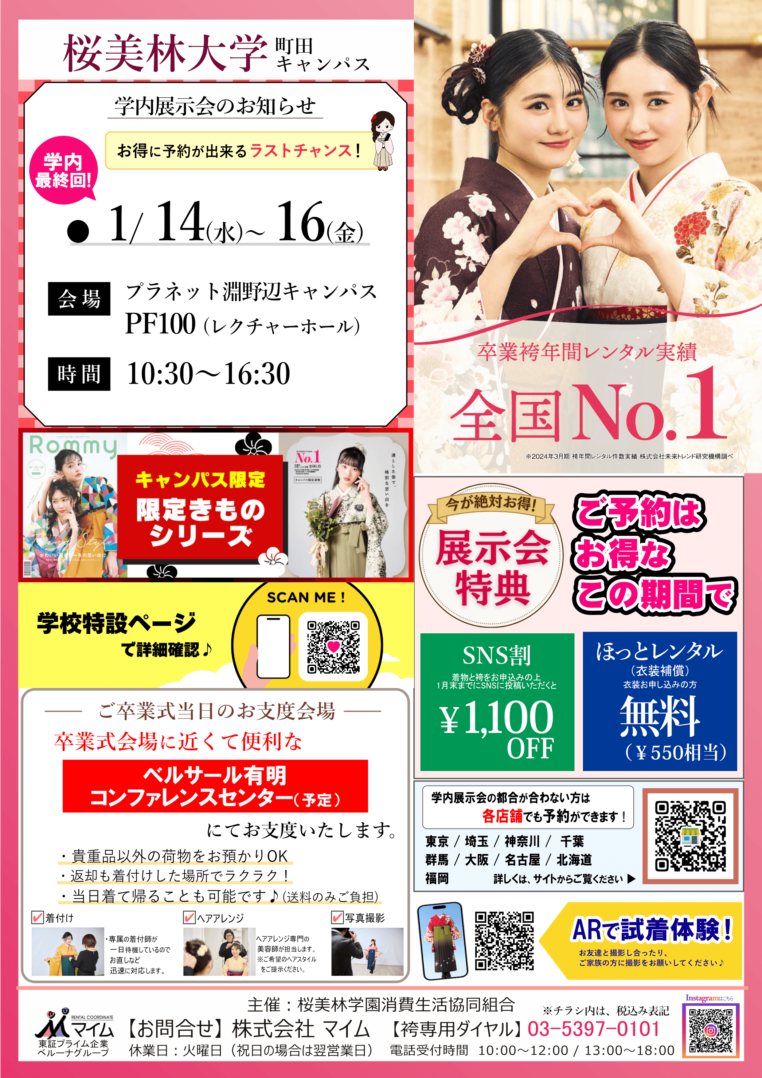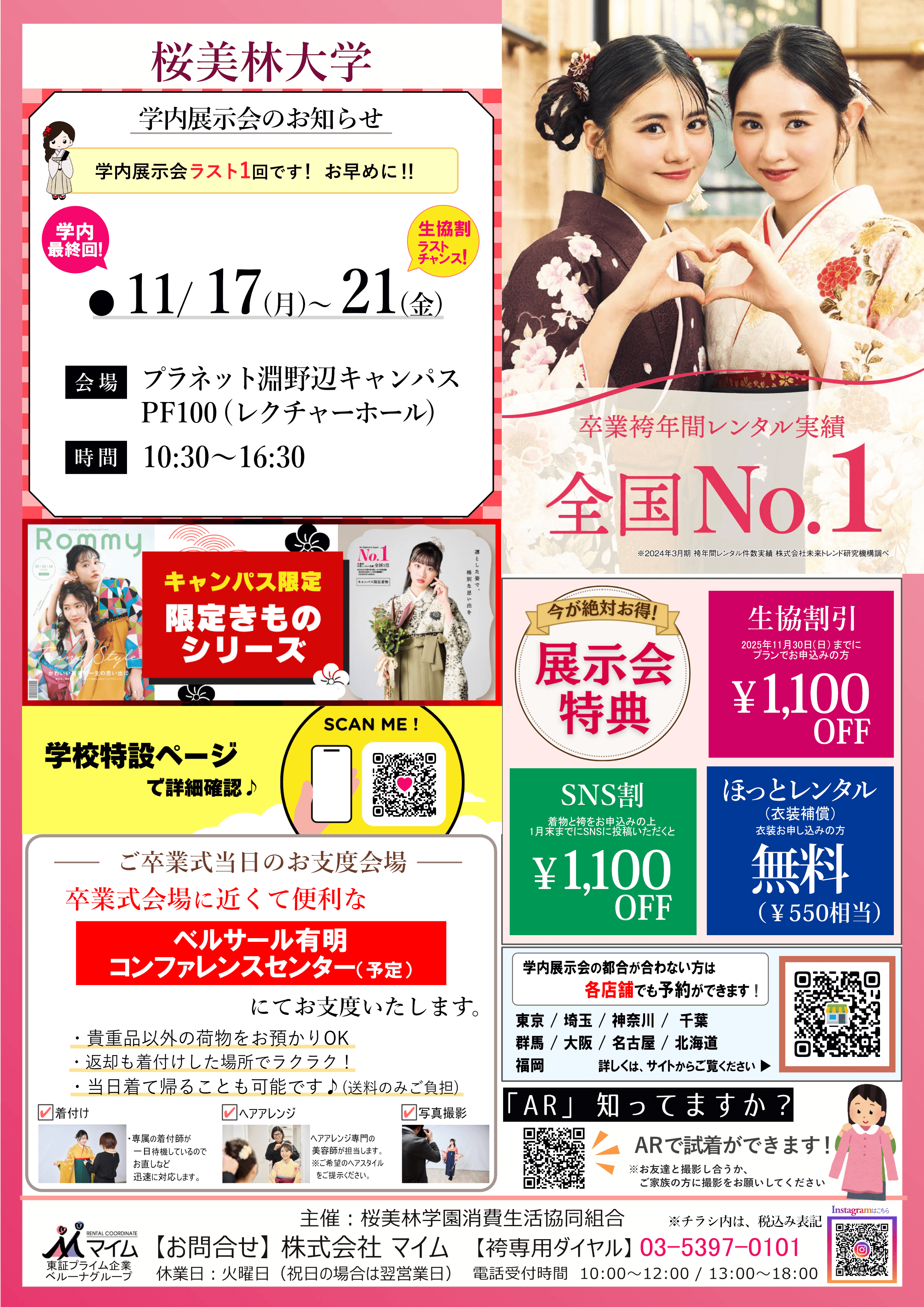 学内予約会は、マイムで人気の着物と袴をあなたの学校で試着したり、気に入ったらその場で予約できちゃう展示会です。※イベントは、急遽延期や中止になる場合もあります。あらかじめご了承ください。
