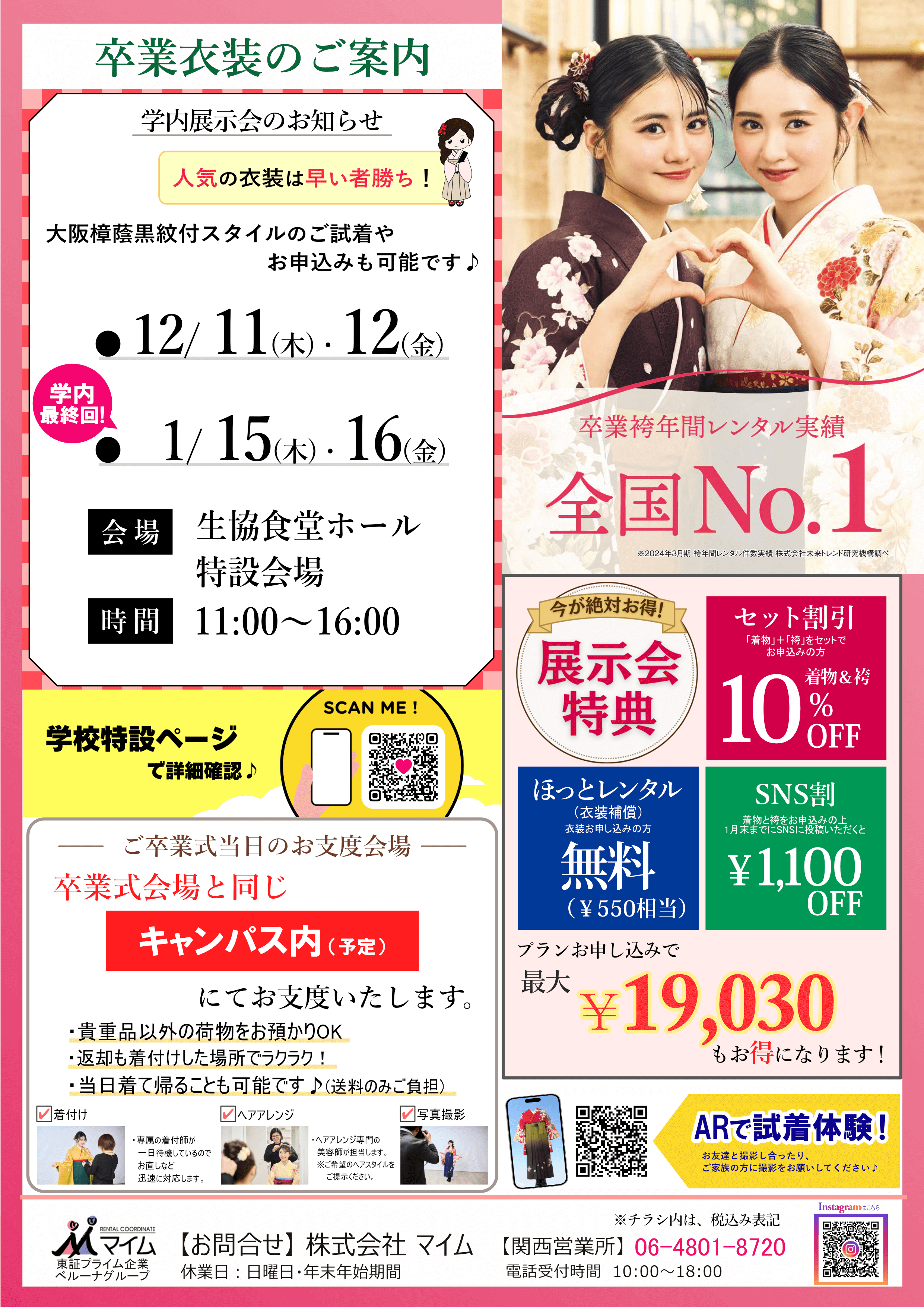 学内予約会は、マイムで人気の着物と袴をあなたの学校で試着したり、気に入ったらその場で予約できちゃう展示会です。※イベントは、急遽延期や中止になる場合もあります。あらかじめご了承ください。