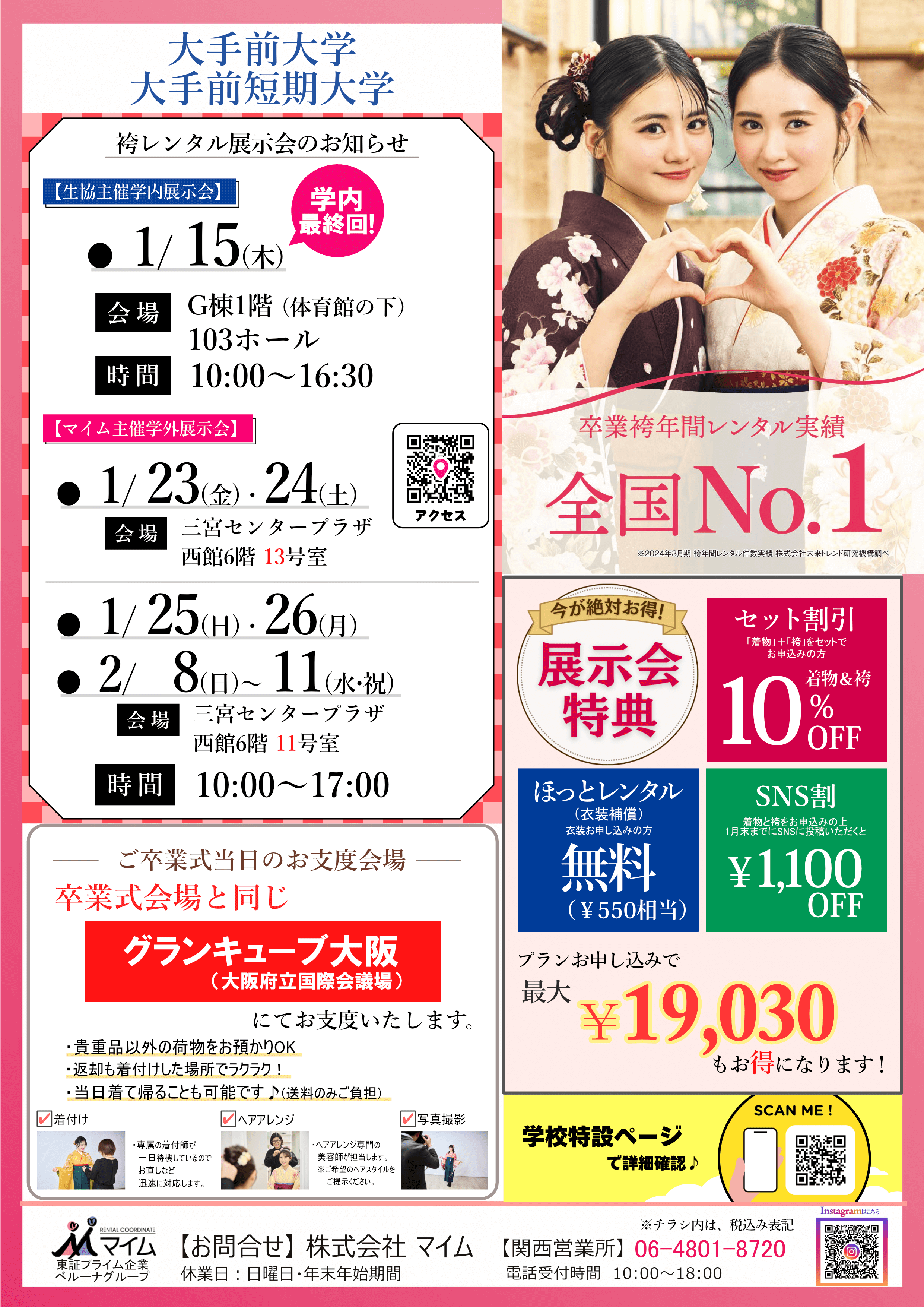 学内予約会は、マイムで人気の着物と袴をあなたの学校で試着したり、気に入ったらその場で予約できちゃう展示会です。※イベントは、急遽延期や中止になる場合もあります。あらかじめご了承ください。