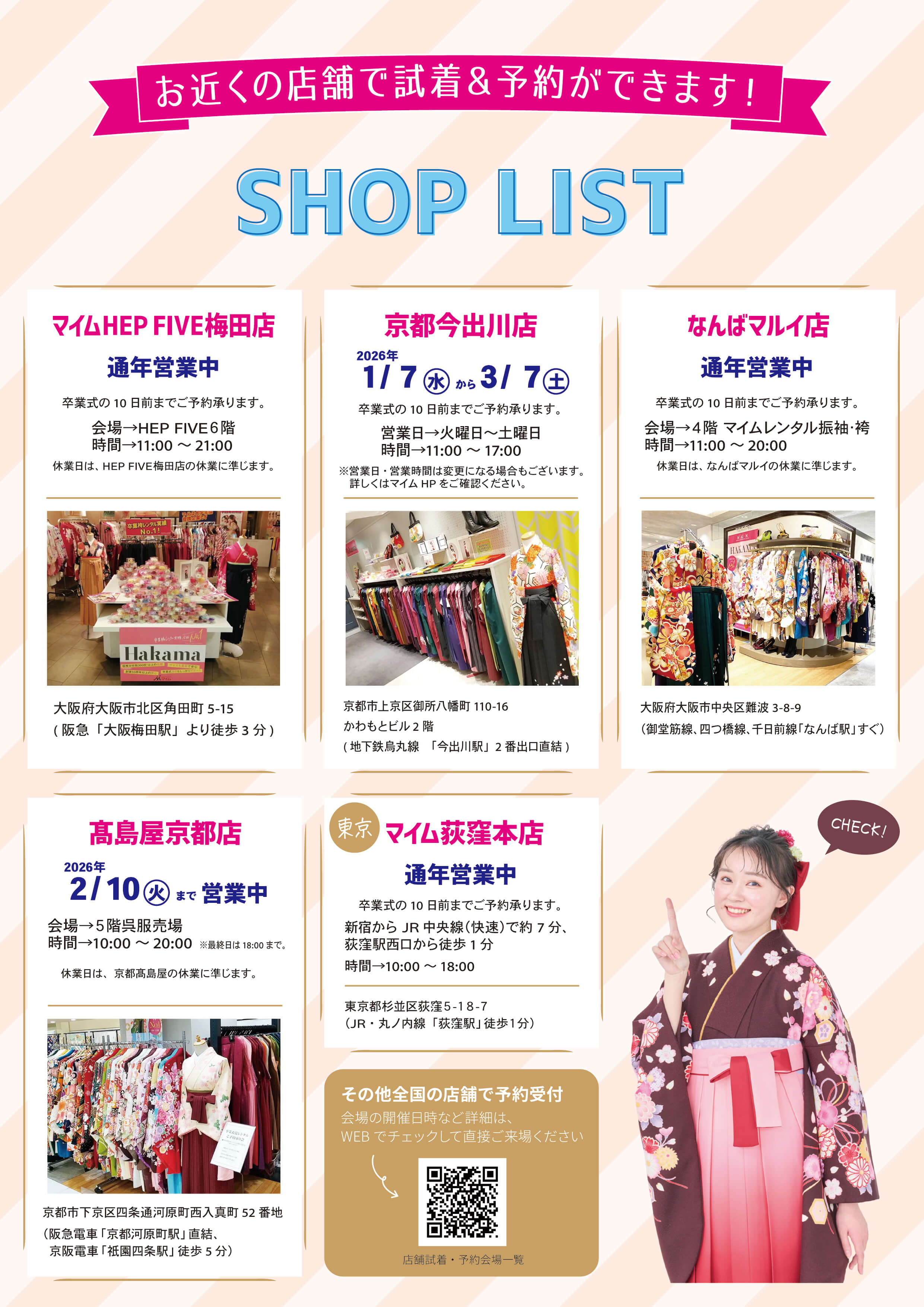 自分の学校の展示会スケジュールが分かったら、事前にマイムの衣装一覧ページから好きな着物をチェックしてみよう!