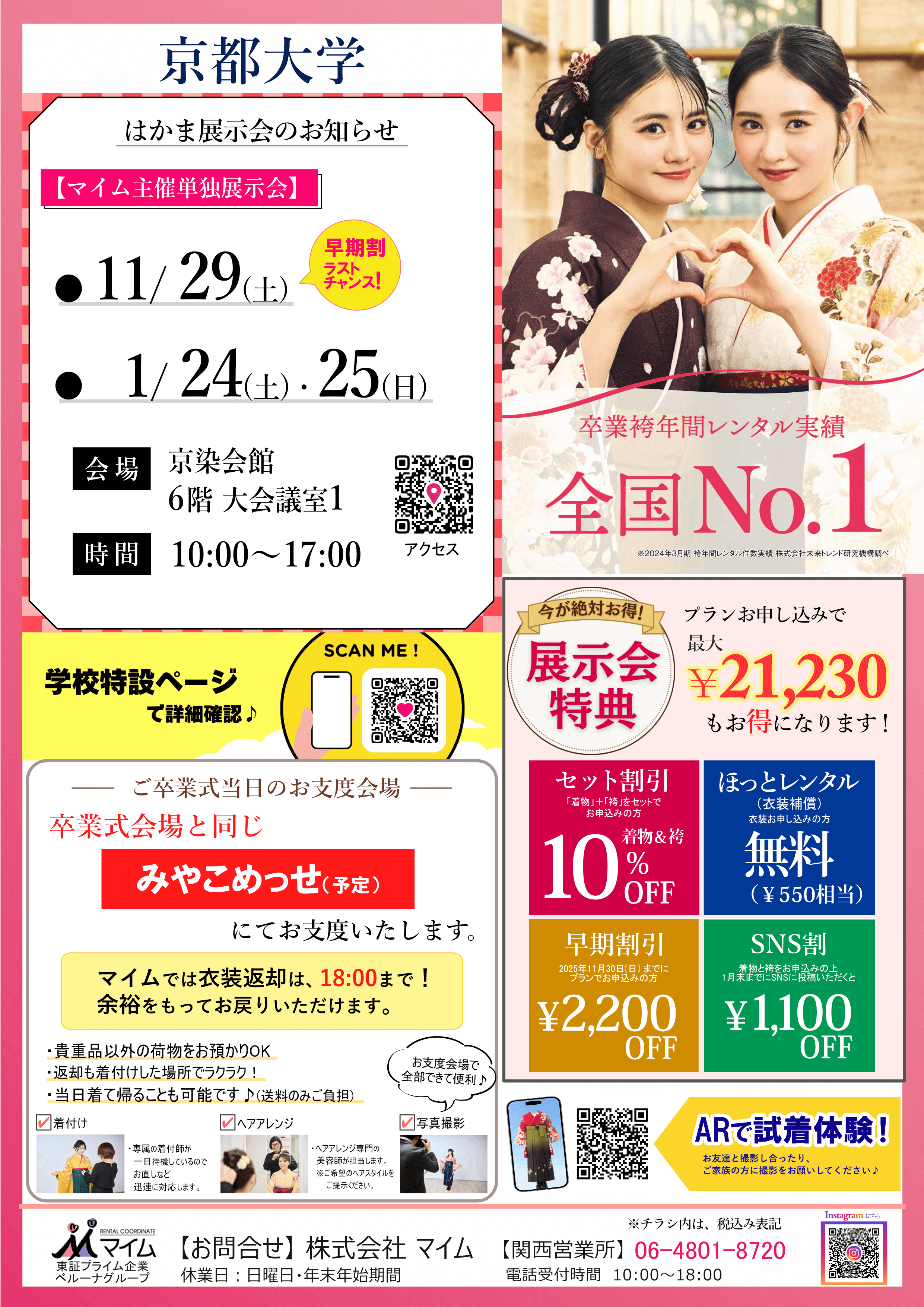 学内予約会は、マイムで人気の着物と袴をあなたの学校で試着したり、気に入ったらその場で予約できちゃう展示会です。※イベントは、急遽延期や中止になる場合もあります。あらかじめご了承ください。