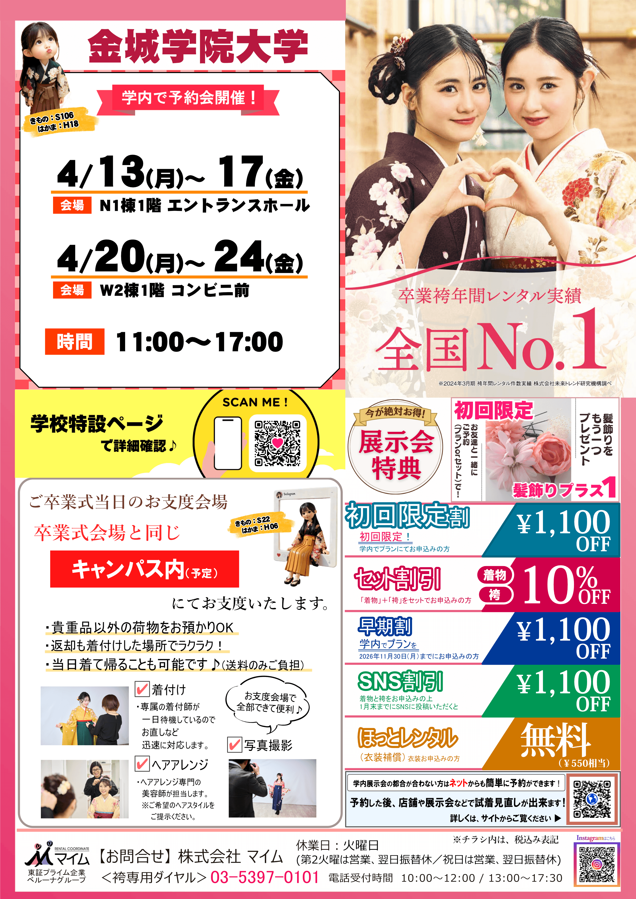 学内予約会は、マイムで人気の着物と袴をあなたの学校で試着したり、気に入ったらその場で予約できちゃう展示会です。※イベントは、急遽延期や中止になる場合もあります。あらかじめご了承ください。