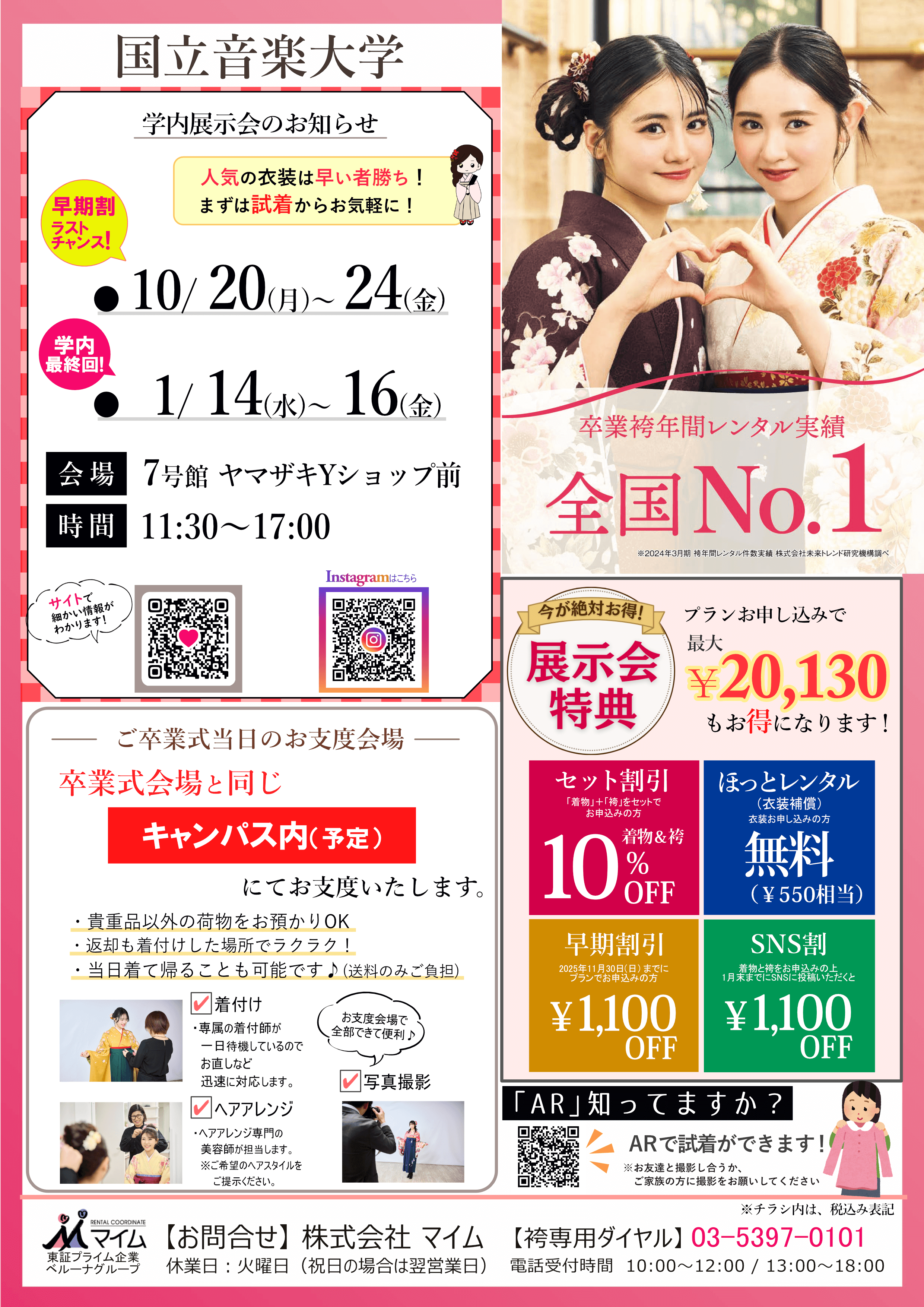 学内予約会は、マイムで人気の着物と袴をあなたの学校で試着したり、気に入ったらその場で予約できちゃう展示会です。※イベントは、急遽延期や中止になる場合もあります。あらかじめご了承ください。