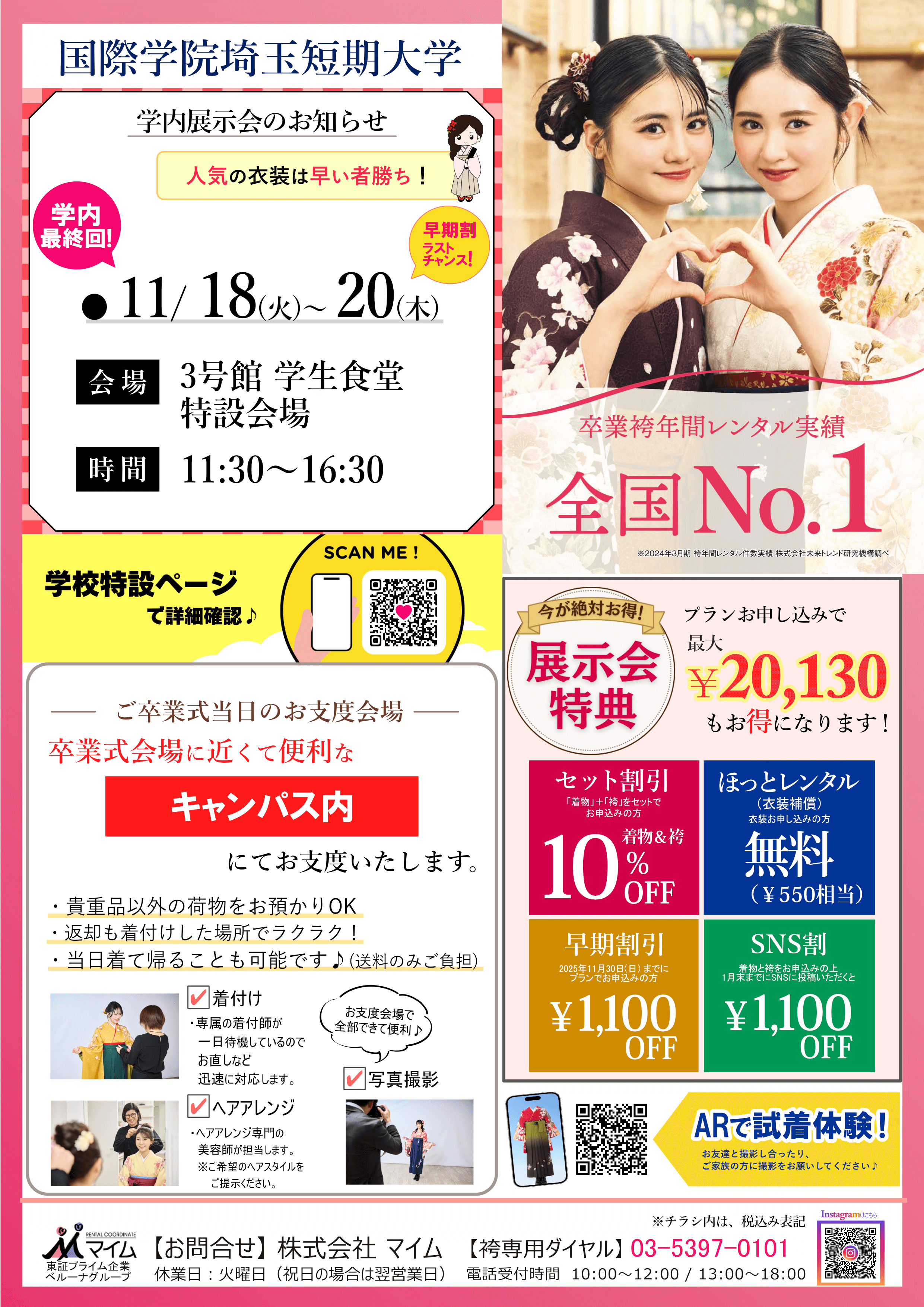 学内予約会は、マイムで人気の着物と袴をあなたの学校で試着したり、気に入ったらその場で予約できちゃう展示会です。※イベントは、急遽延期や中止になる場合もあります。あらかじめご了承ください。