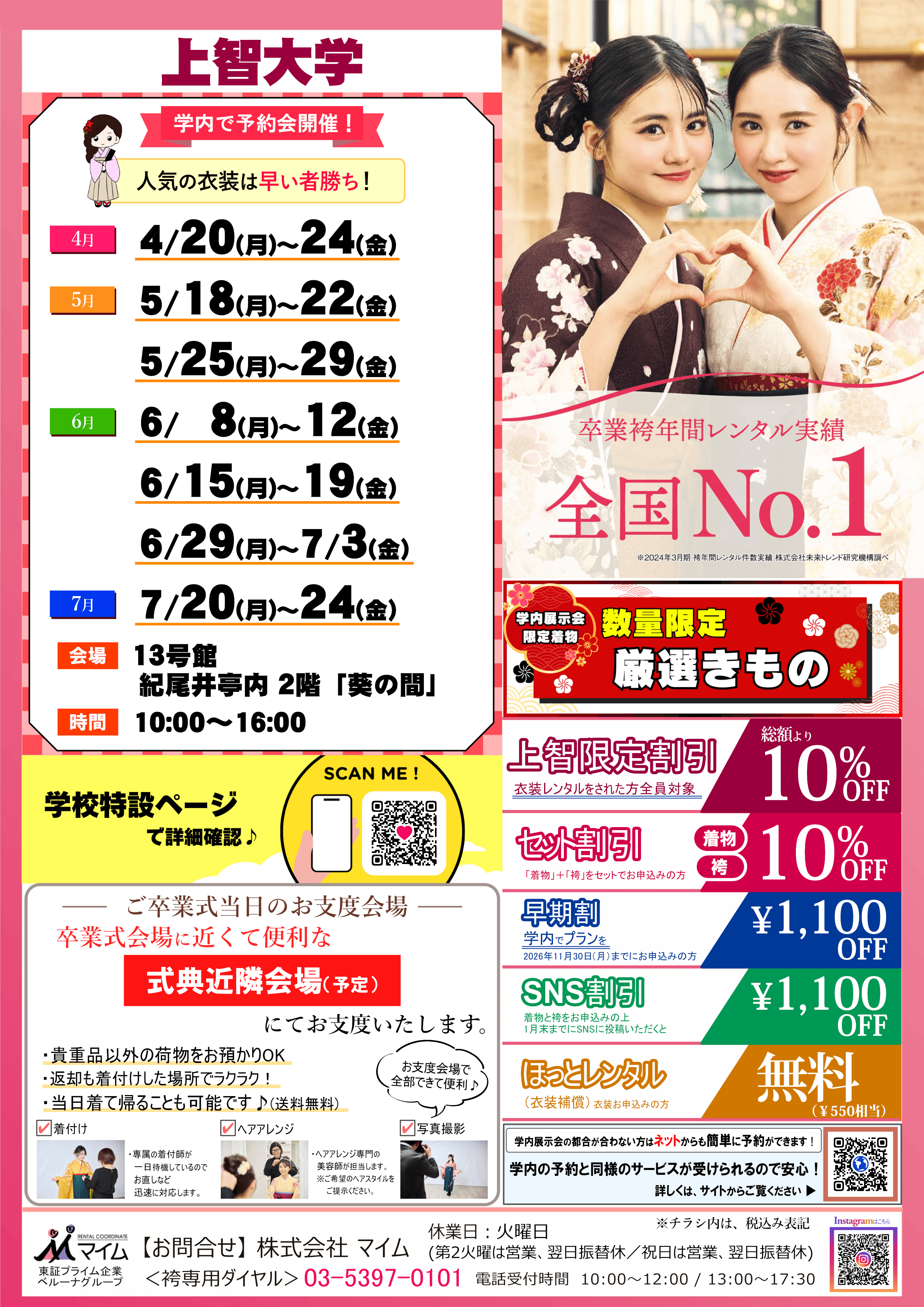 袴レンタルがスタートしました!また、上智大学の皆様は