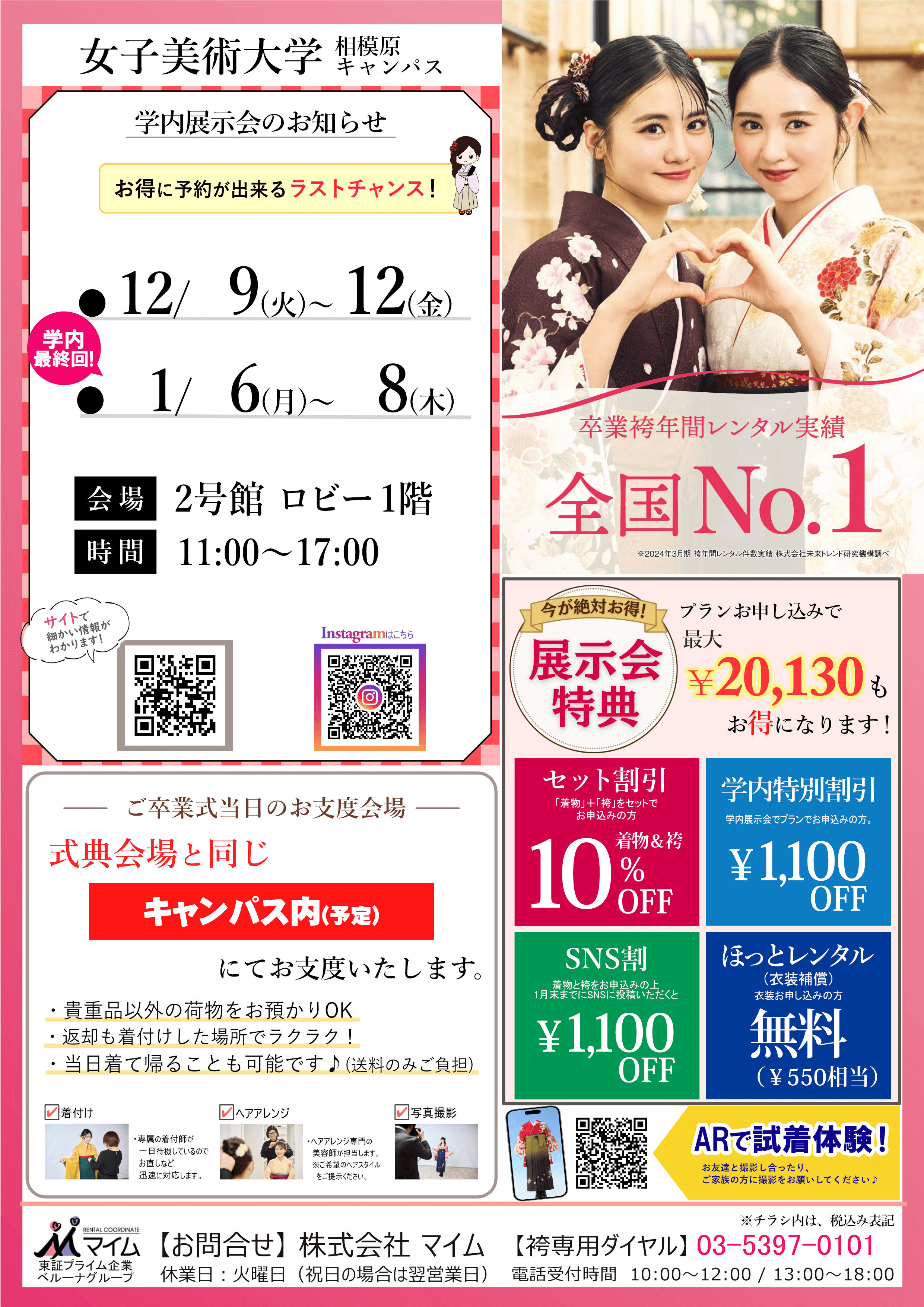 学内予約会は、マイムで人気の着物と袴をあなたの学校で試着したり、気に入ったらその場で予約できちゃう展示会です。※イベントは、急遽延期や中止になる場合もあります。あらかじめご了承ください。