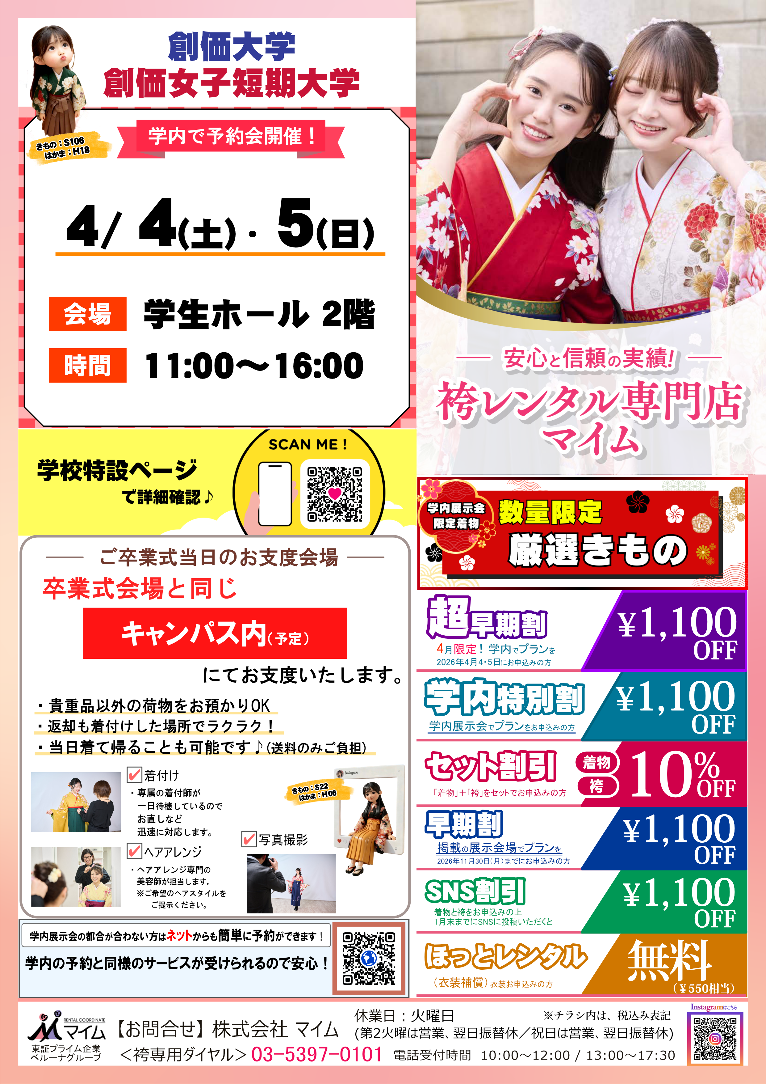 学内予約会は、マイムで人気の着物と袴をあなたの学校で試着したり、気に入ったらその場で予約できちゃう展示会です。※イベントは、急遽延期や中止になる場合もあります。あらかじめご了承ください。