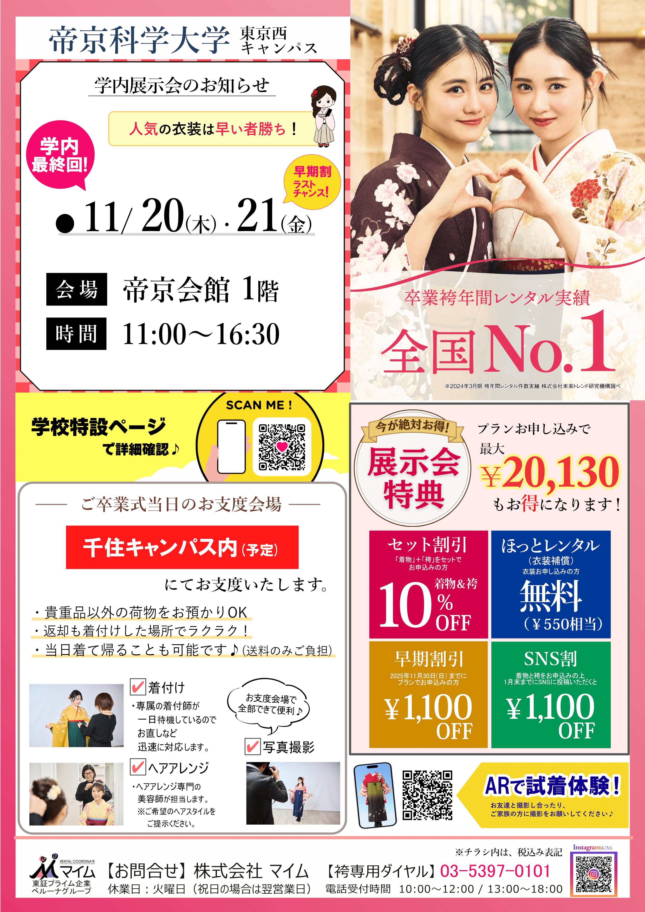 帝京科学大学 東京西 ー 2026年卒業式レンタル袴情報 ー