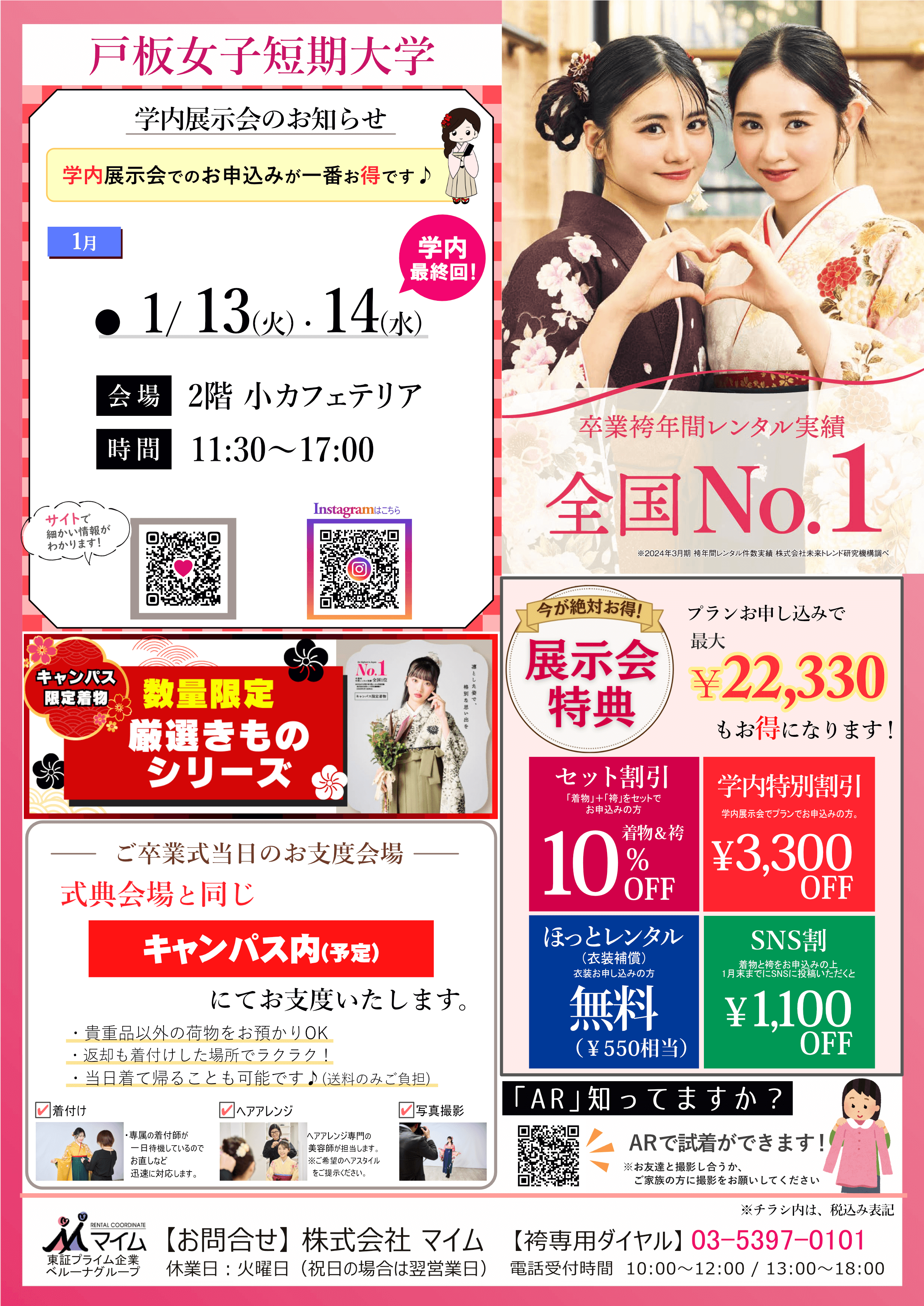 学内予約会は、マイムで人気の着物と袴をあなたの学校で試着したり、気に入ったらその場で予約できちゃう展示会です。※イベントは、急遽延期や中止になる場合もあります。あらかじめご了承ください。