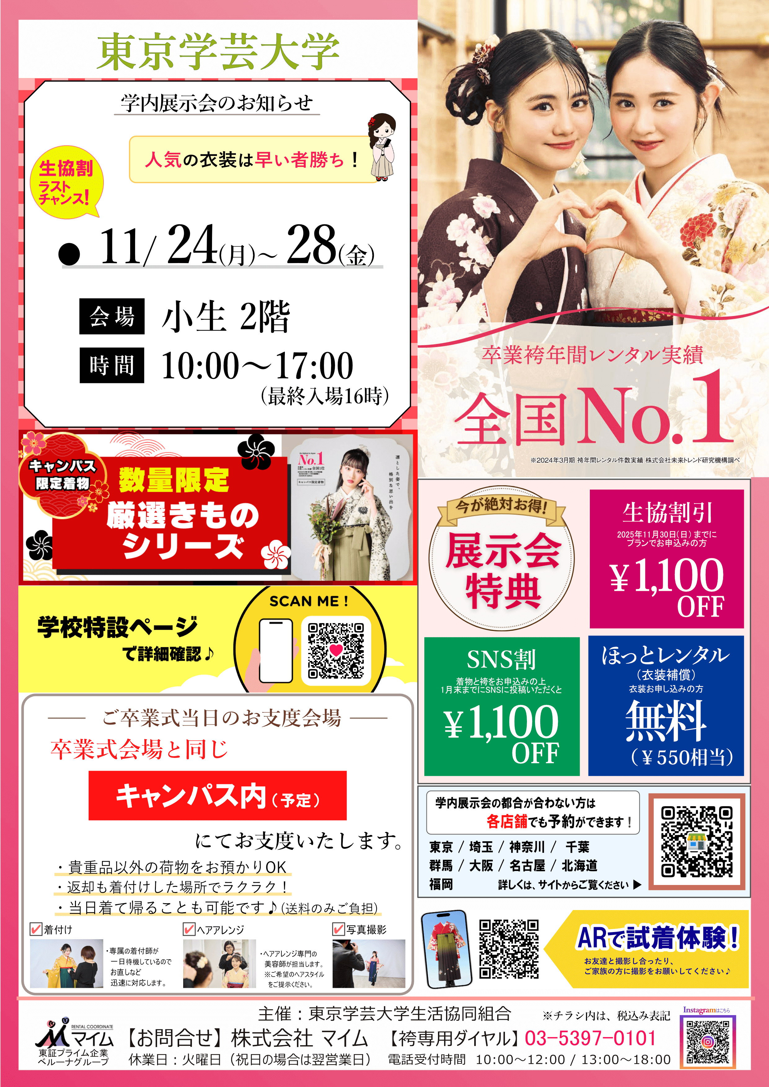 学内予約会は、マイムで人気の着物と袴をあなたの学校で試着したり、気に入ったらその場で予約できちゃう展示会です。※イベントは、急遽延期や中止になる場合もあります。あらかじめご了承ください。