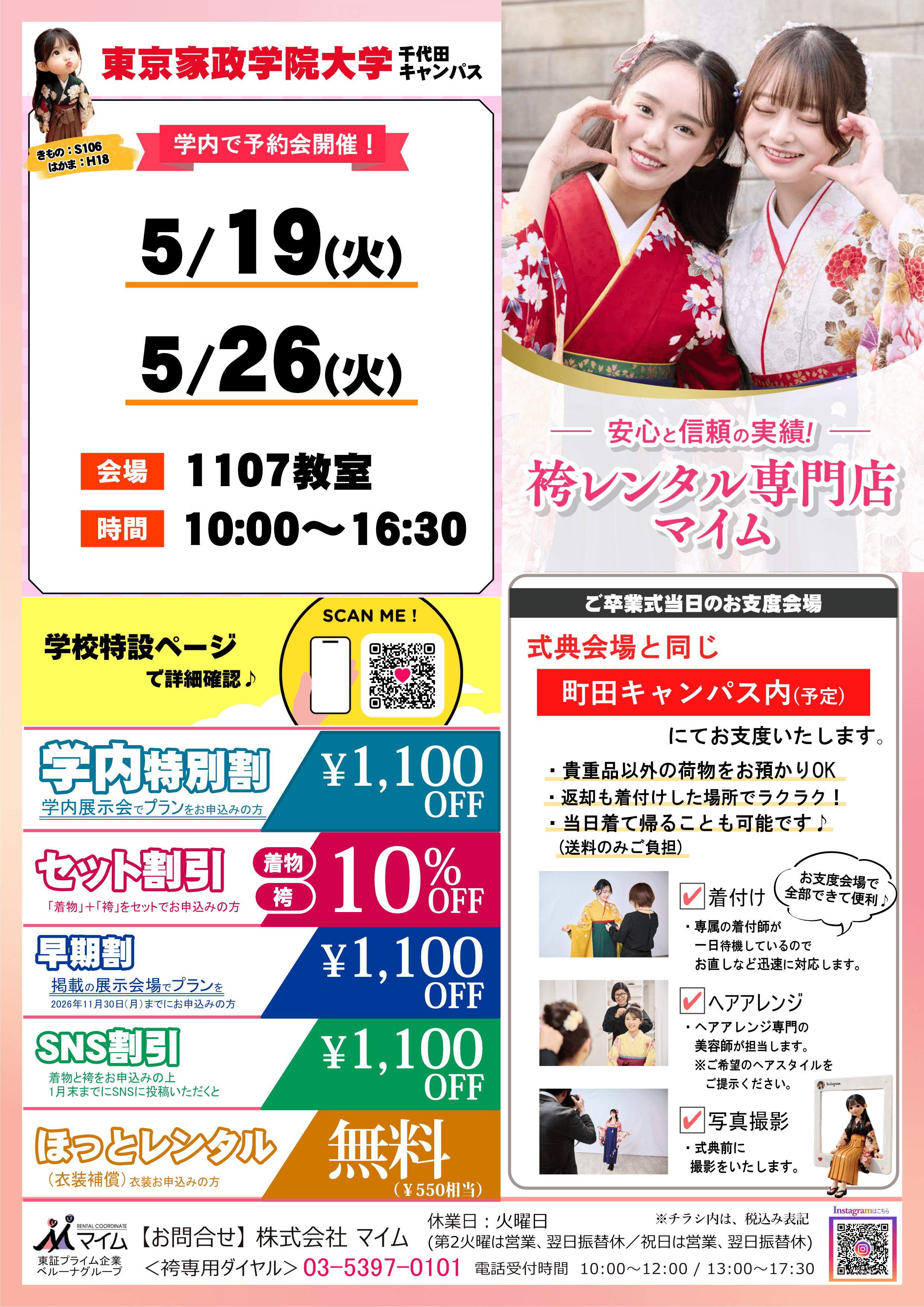東京家政学院大学 千代田 ー 2027年卒業式レンタル袴情報 ー