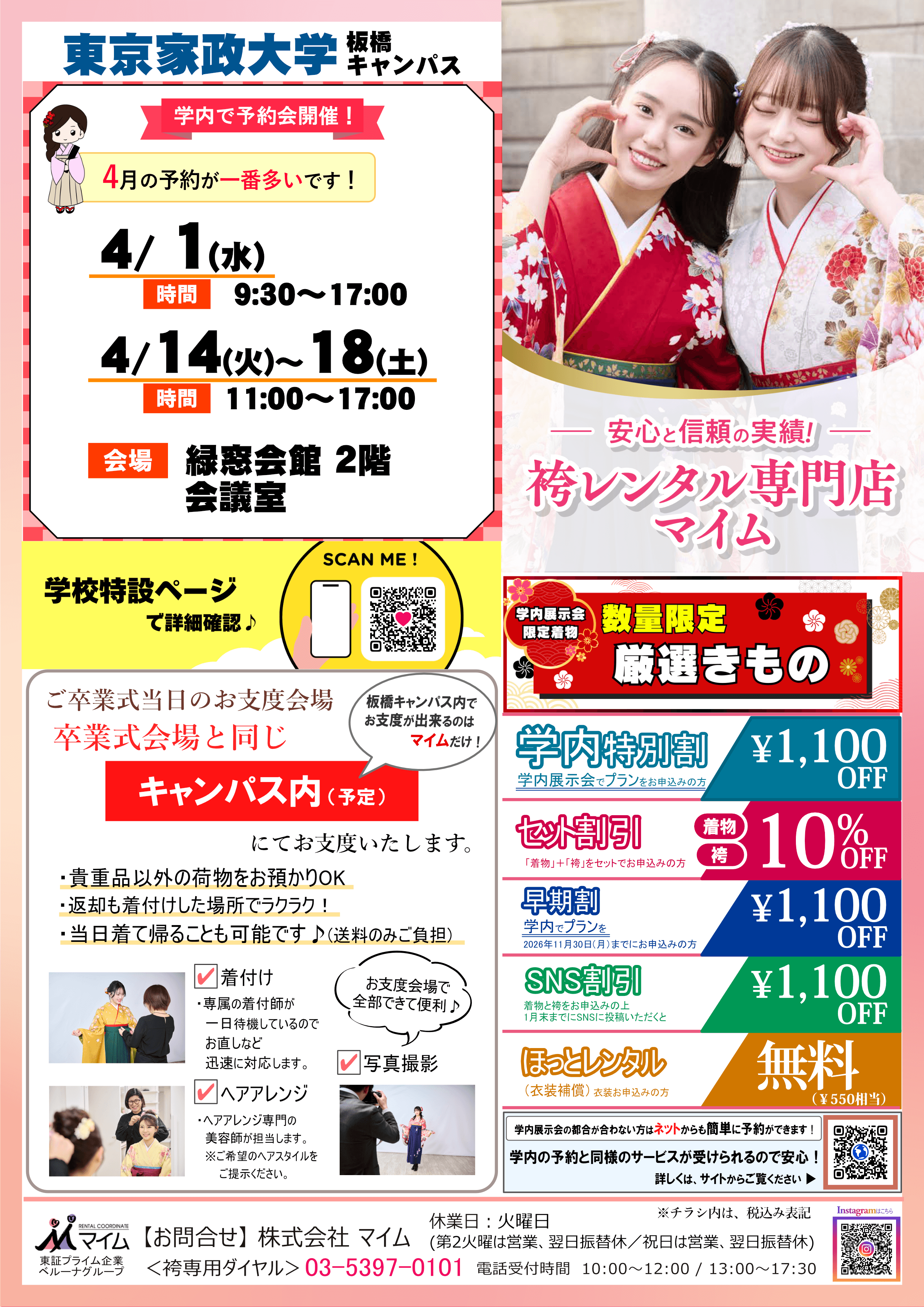 学内予約会は、マイムで人気の着物と袴をあなたの学校で試着したり、気に入ったらその場で予約できちゃう展示会です。※イベントは、急遽延期や中止になる場合もあります。あらかじめご了承ください。