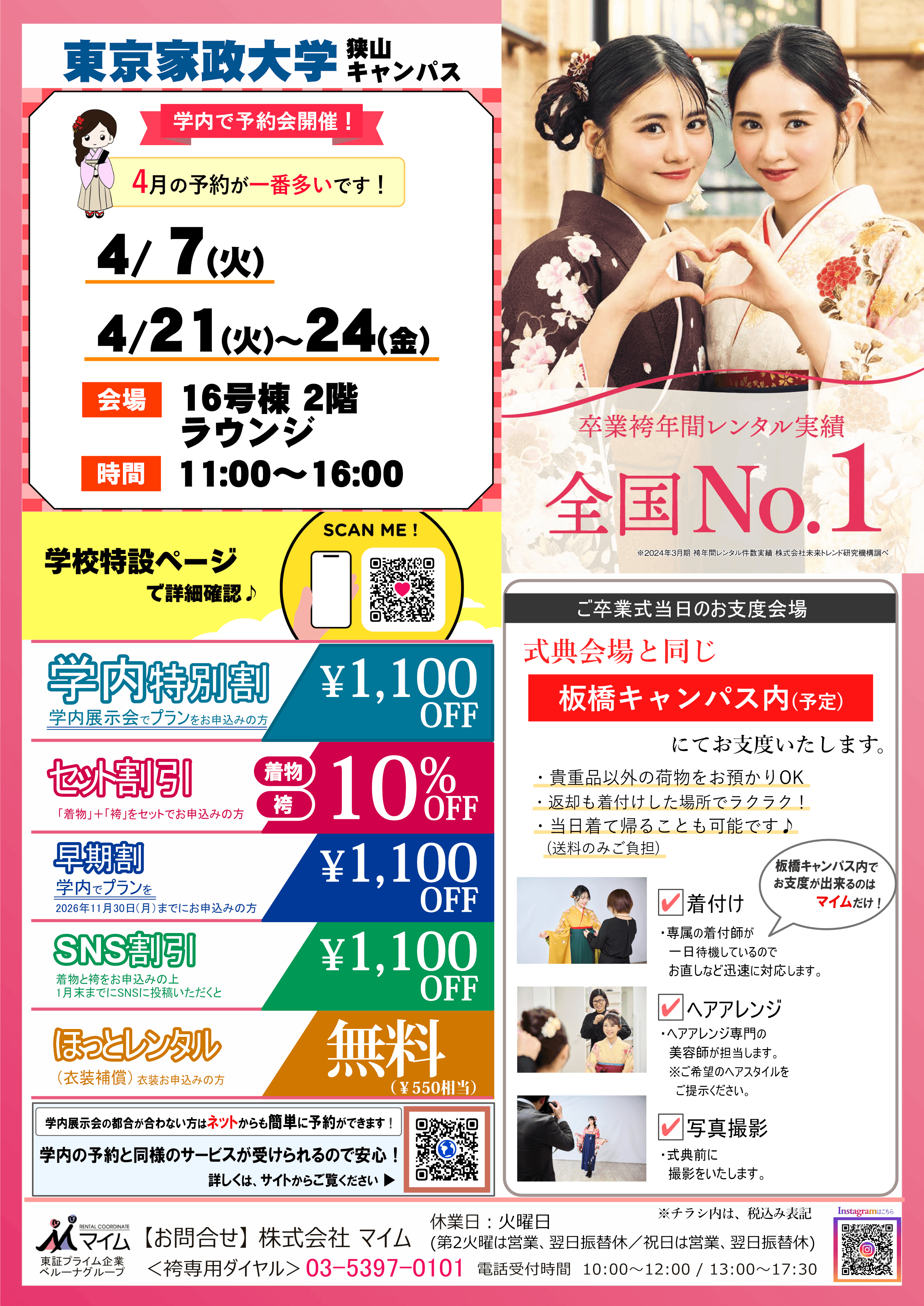 学内予約会は、マイムで人気の着物と袴をあなたの学校で試着したり、気に入ったらその場で予約できちゃう展示会です。※イベントは、急遽延期や中止になる場合もあります。あらかじめご了承ください。