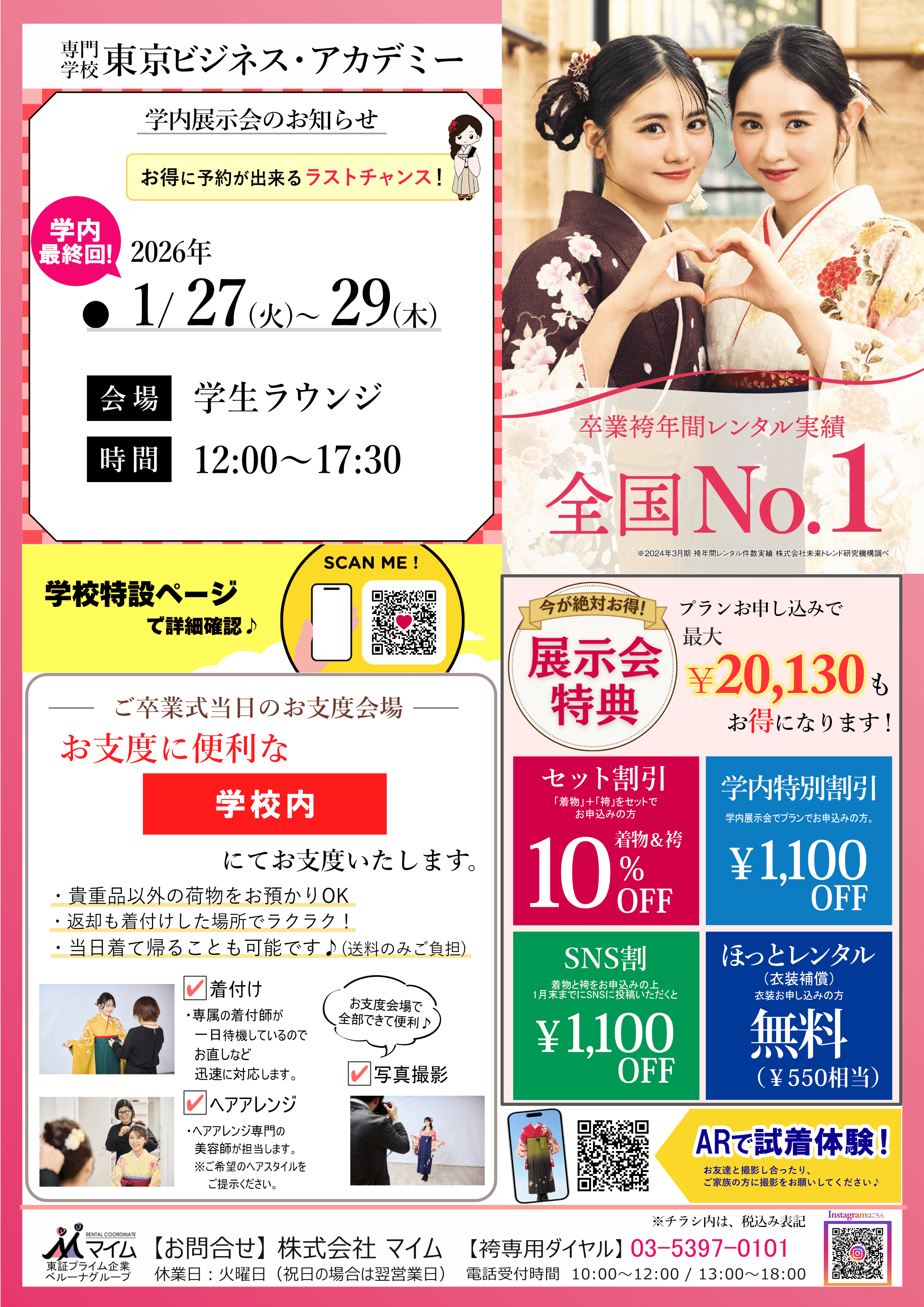 専門学校 東京ビジネス・アカデミー ー 2026年卒業式レンタル袴情報 ー