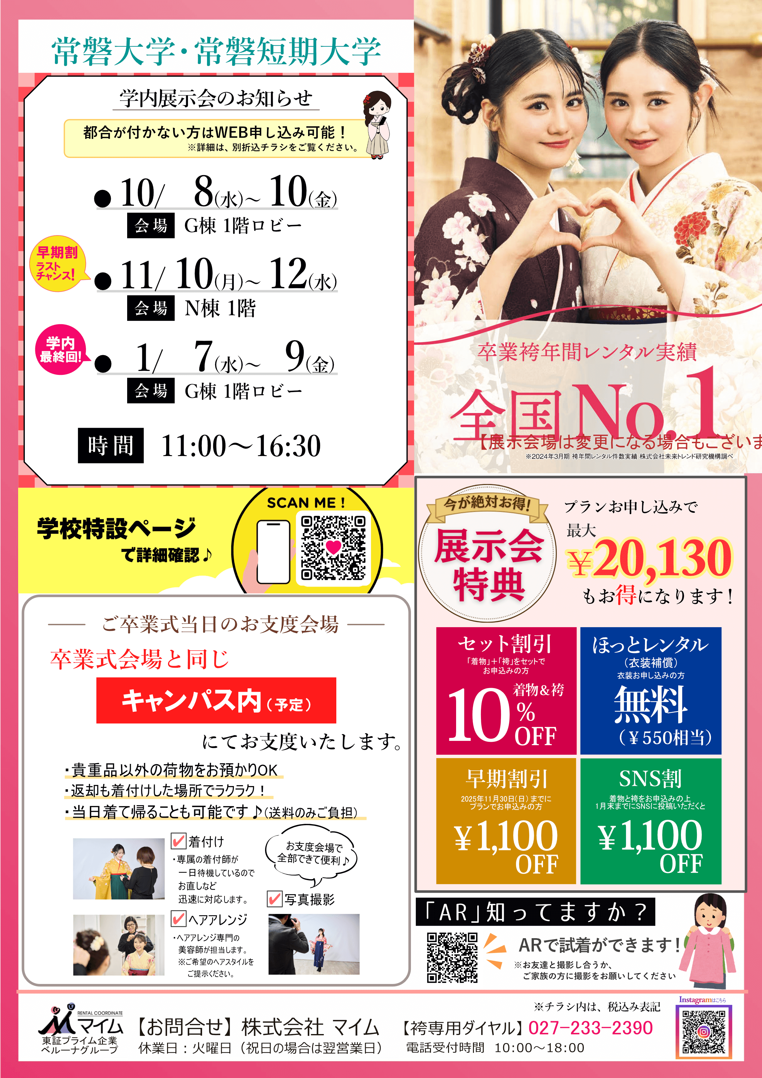 学内予約会は、マイムで人気の着物と袴をあなたの学校で試着したり、気に入ったらその場で予約できちゃう展示会です。※イベントは、急遽延期や中止になる場合もあります。あらかじめご了承ください。