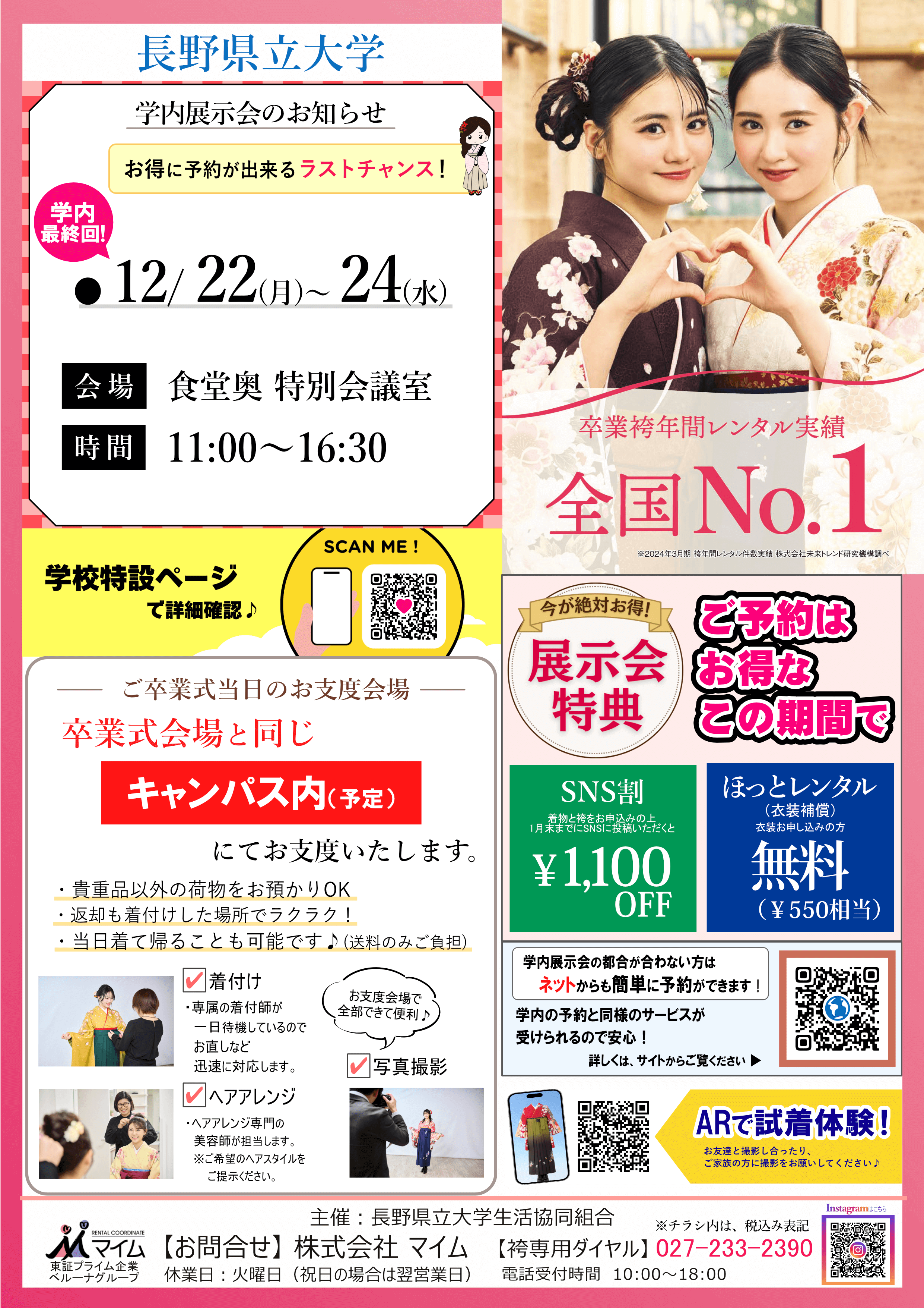 学内予約会は、マイムで人気の着物と袴をあなたの学校で試着したり、気に入ったらその場で予約できちゃう展示会です。※イベントは、急遽延期や中止になる場合もあります。あらかじめご了承ください。