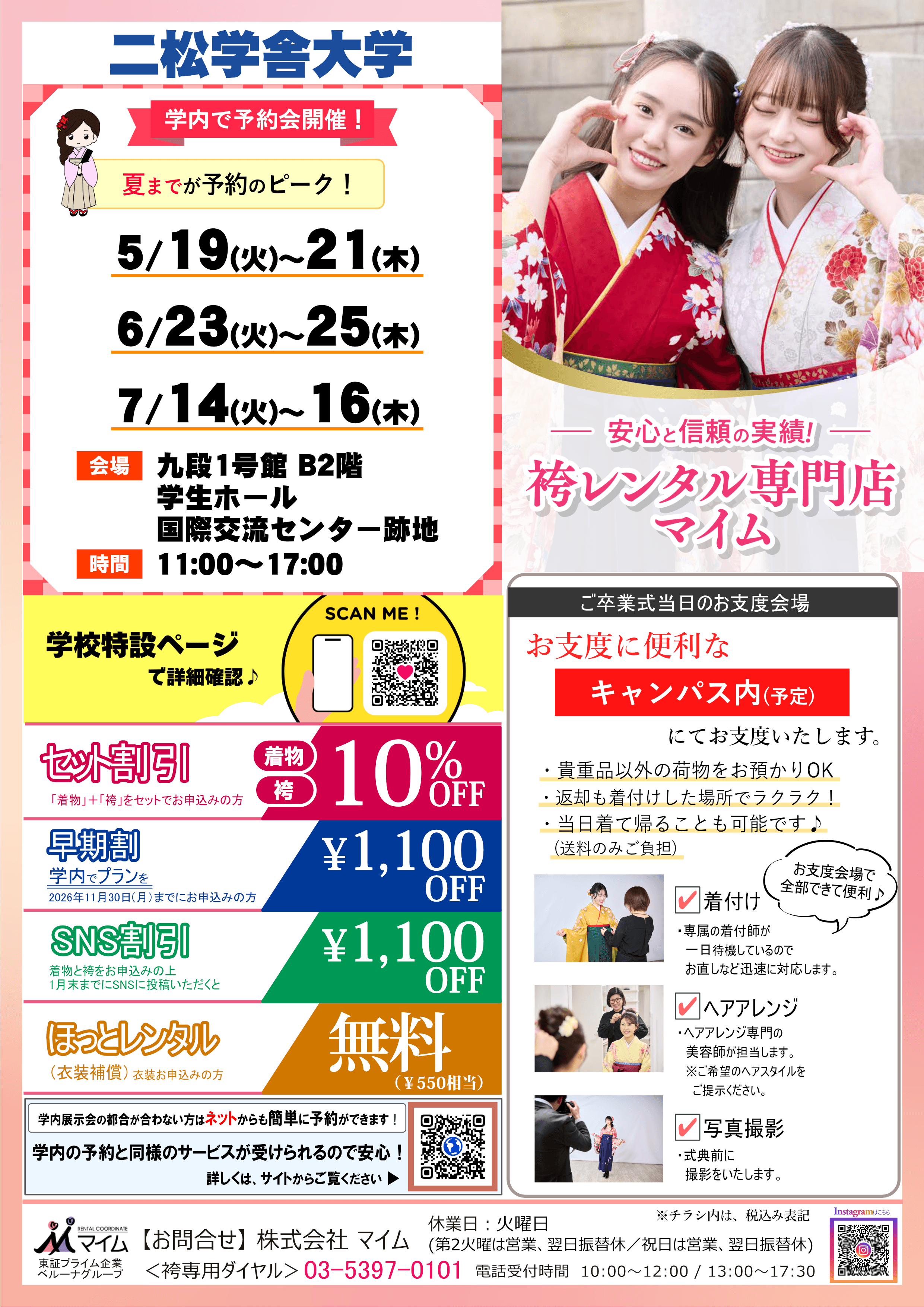 学内予約会は、マイムで人気の着物と袴をあなたの学校で試着したり、気に入ったらその場で予約できちゃう展示会です。※イベントは、急遽延期や中止になる場合もあります。あらかじめご了承ください。