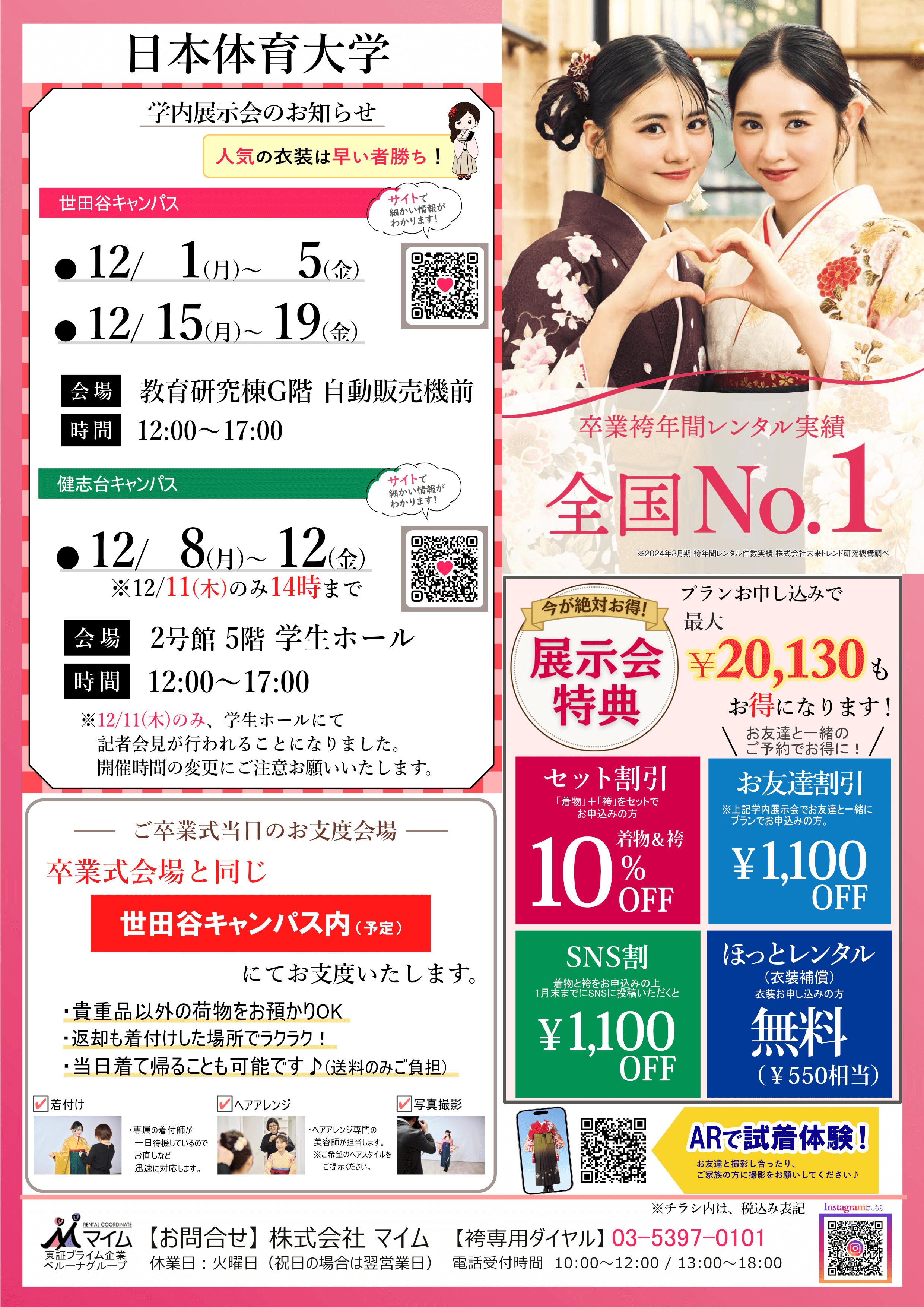 学内予約会は、マイムで人気の着物と袴をあなたの学校で試着したり、気に入ったらその場で予約できちゃう展示会です。※イベントは、急遽延期や中止になる場合もあります。あらかじめご了承ください。