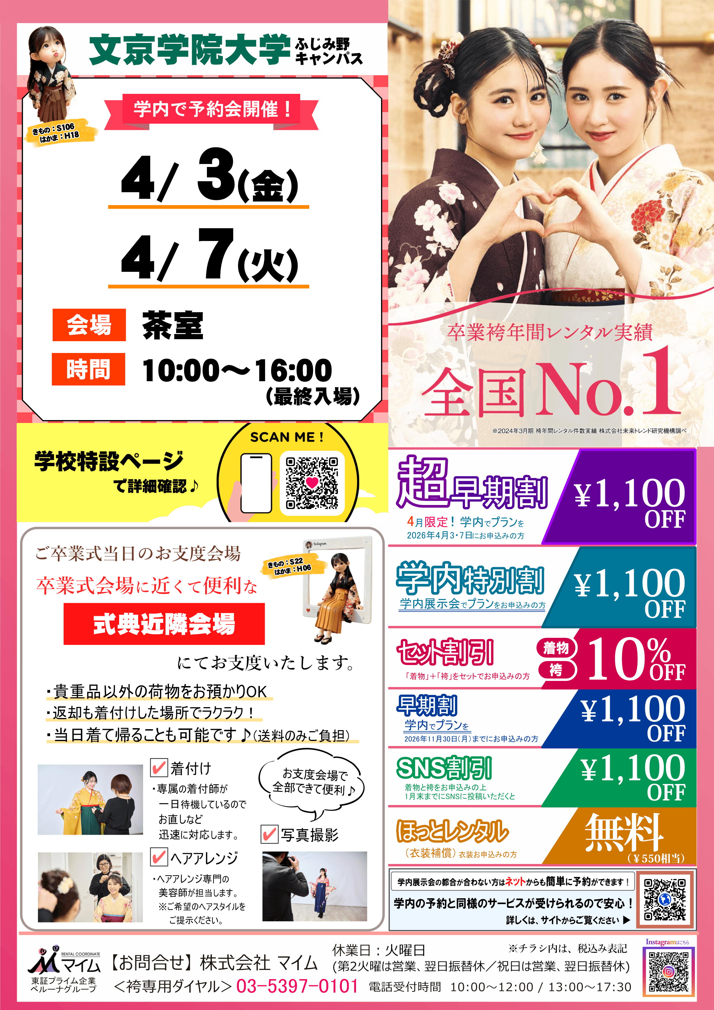 学内予約会は、マイムで人気の着物と袴をあなたの学校で試着したり、気に入ったらその場で予約できちゃう展示会です。※イベントは、急遽延期や中止になる場合もあります。あらかじめご了承ください。
