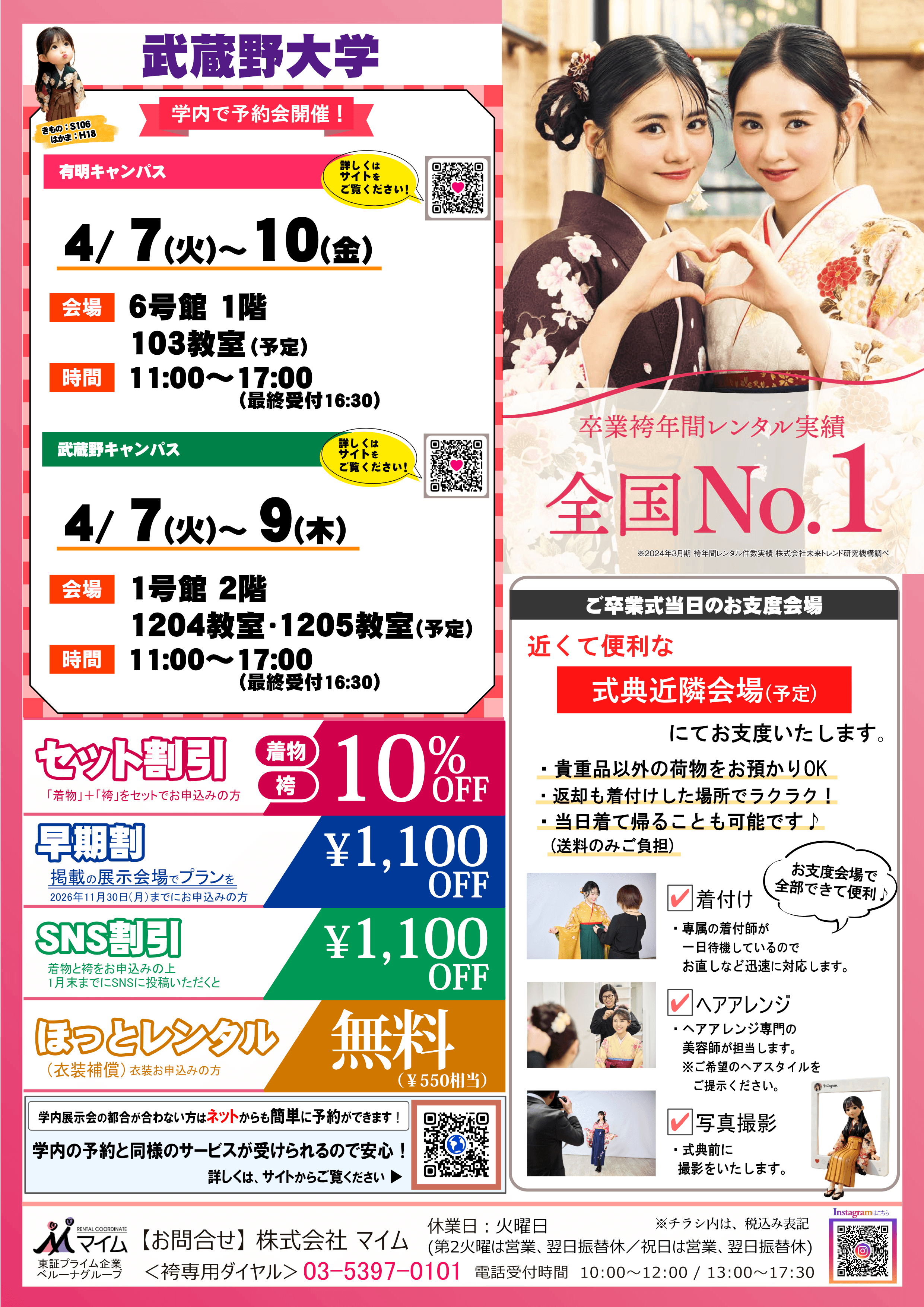 武蔵野大学 武蔵野キャンパス ー 2027年卒業式レンタル袴情報 ー