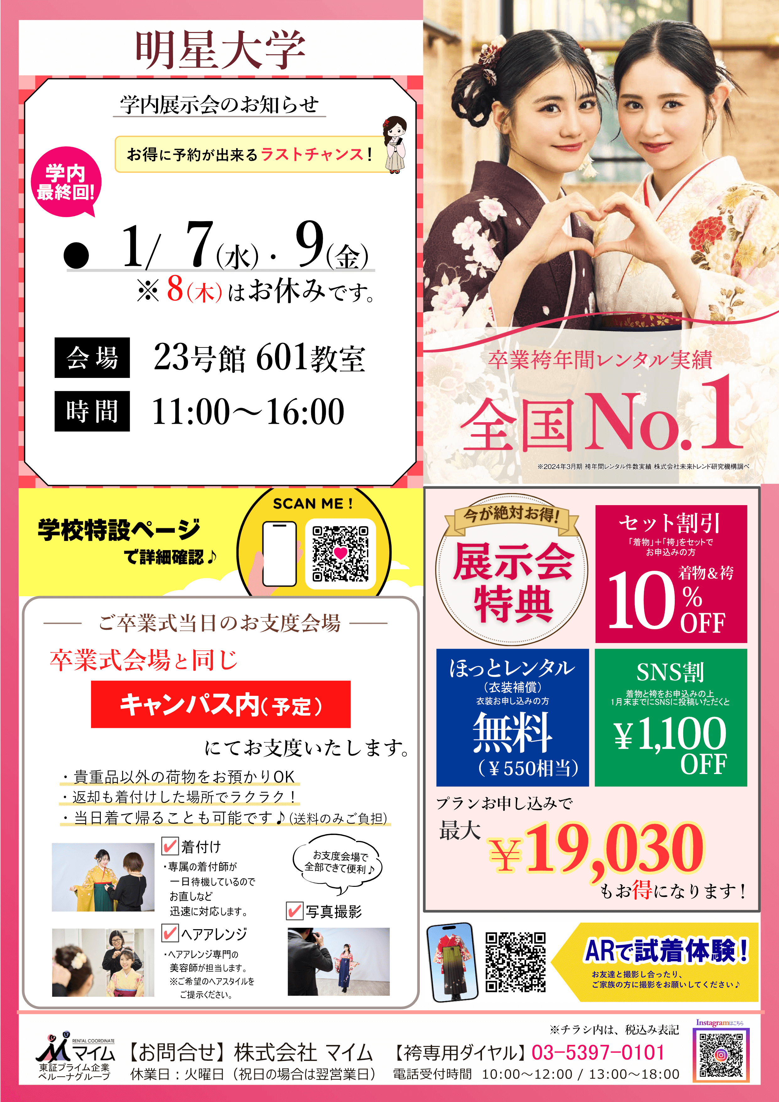 学内予約会は、マイムで人気の着物と袴をあなたの学校で試着したり、気に入ったらその場で予約できちゃう展示会です。※イベントは、急遽延期や中止になる場合もあります。あらかじめご了承ください。