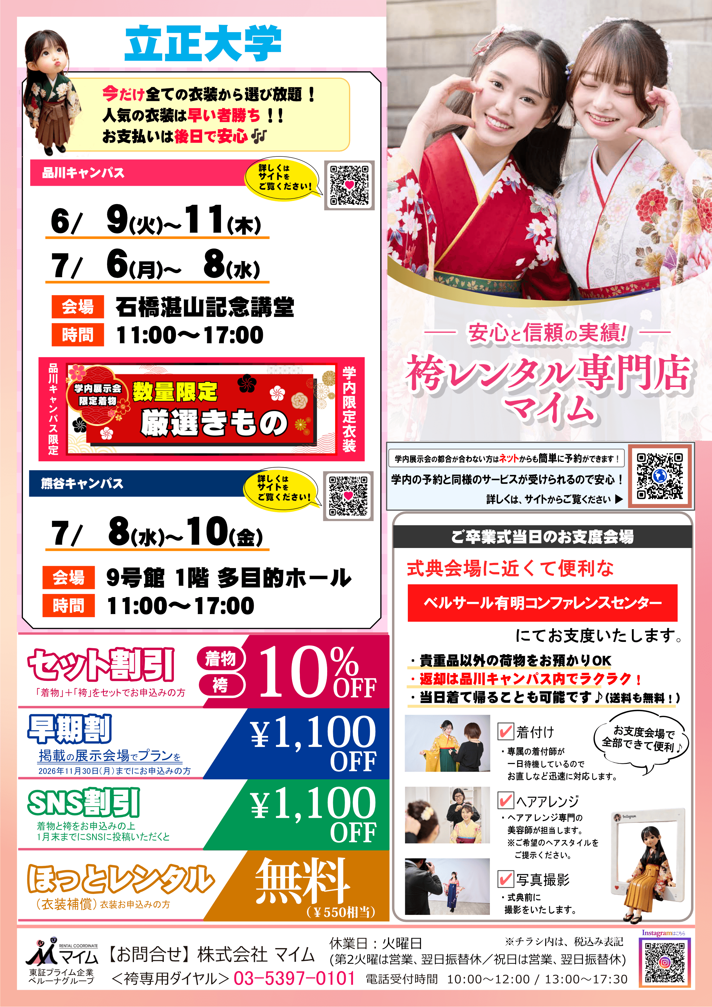 学内予約会は、マイムで人気の着物と袴をあなたの学校で試着したり、気に入ったらその場で予約できちゃう展示会です。※イベントは、急遽延期や中止になる場合もあります。あらかじめご了承ください。