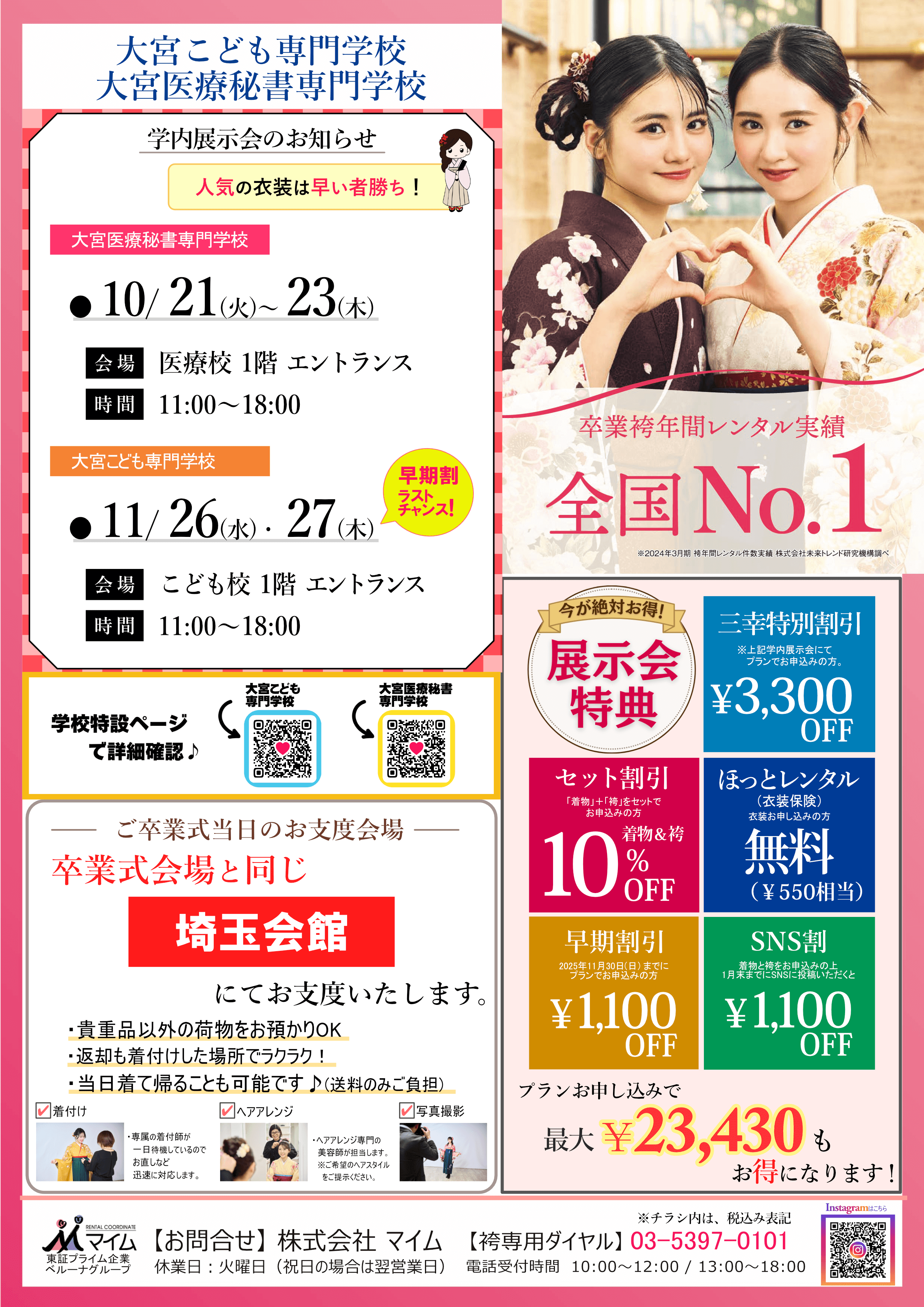 学内予約会は、マイムで人気の着物と袴をあなたの学校で試着したり、気に入ったらその場で予約できちゃう展示会です。※イベントは、急遽延期や中止になる場合もあります。あらかじめご了承ください。