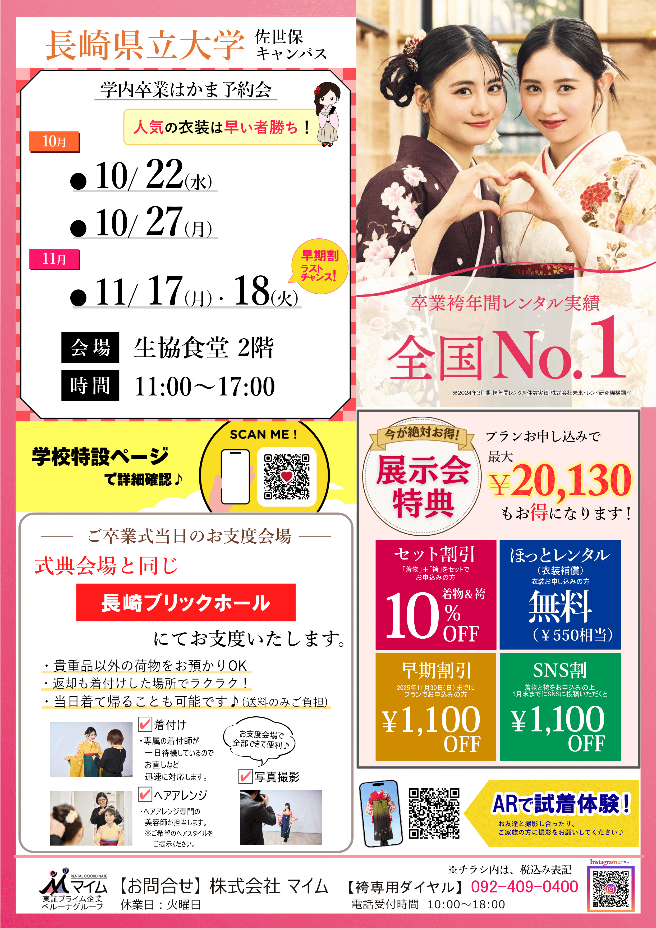 学内予約会は、マイムで人気の着物と袴をあなたの学校で試着したり、気に入ったらその場で予約できちゃう展示会です。※イベントは、急遽延期や中止になる場合もあります。あらかじめご了承ください。