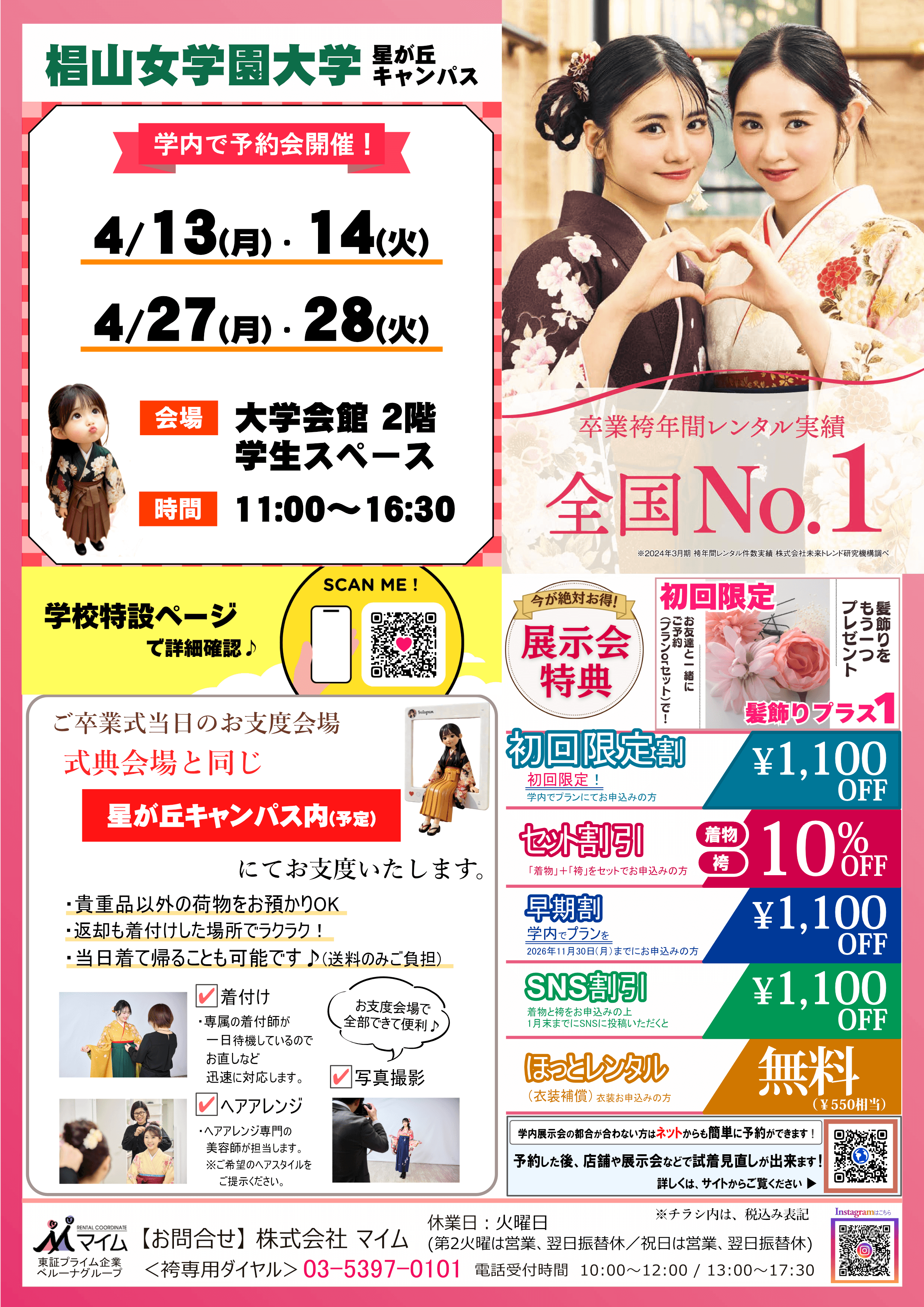 学内予約会は、マイムで人気の着物と袴をあなたの学校で試着したり、気に入ったらその場で予約できちゃう展示会です。※イベントは、急遽延期や中止になる場合もあります。あらかじめご了承ください。