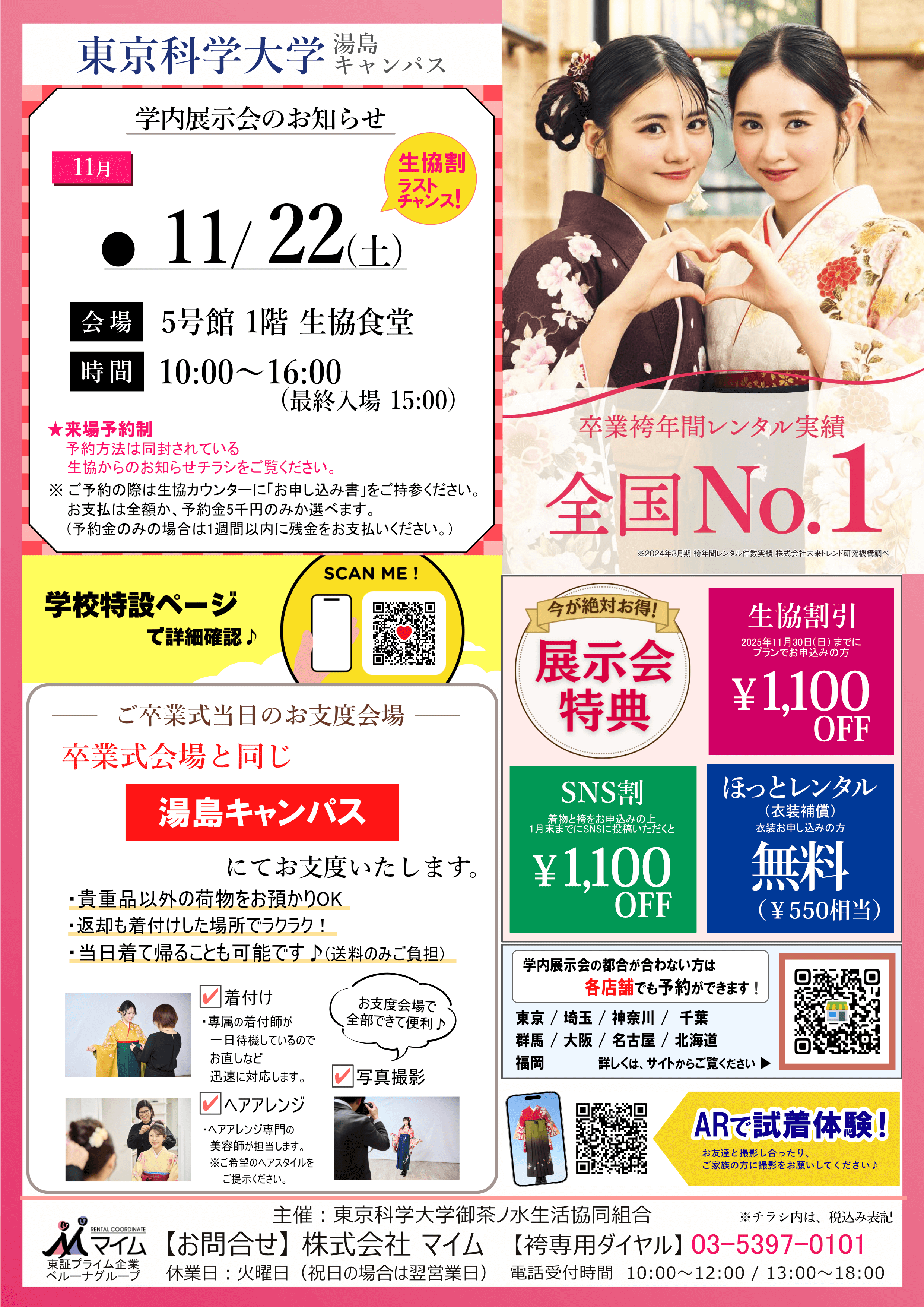 学内予約会は、マイムで人気の着物と袴をあなたの学校で試着したり、気に入ったらその場で予約できちゃう展示会です。※イベントは、急遽延期や中止になる場合もあります。あらかじめご了承ください。